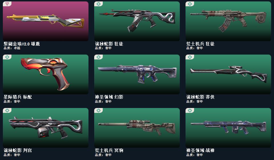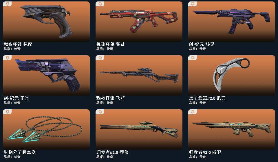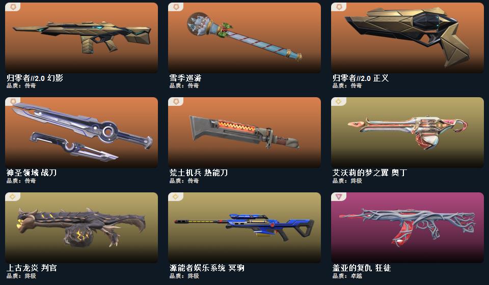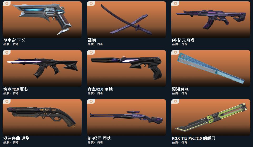 创·纪元套装,归零者//2.0套装 ,离子武器//2.0 爪刀,神圣领域 战刀,RGX 11z Pro//2.0 蝴蝶刀,镭切,荒土机兵 热能刀,雪季巡游,生物分子解离器,澄湖潋滟