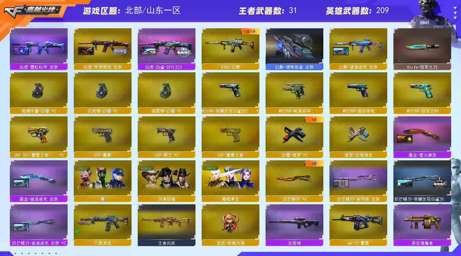 幻兽5套/传说幽瞳/天袭/幻影满配副手/幻裁三件套G36幻影/神威莲华影煞满级八面双泡泡象金狮子满配;USP-雷暴,USP-雷暴王者,柯尔特-荣耀世冠白鲨2023,柯尔特-冠军之特,炽芒蝶刃,Knife-冠军之刃,沙漠玫瑰,