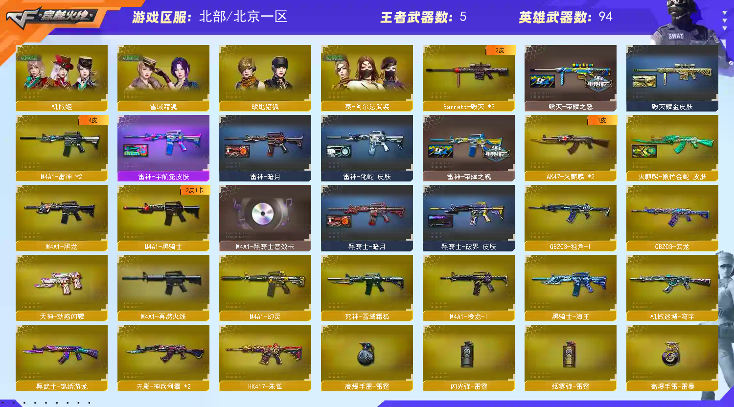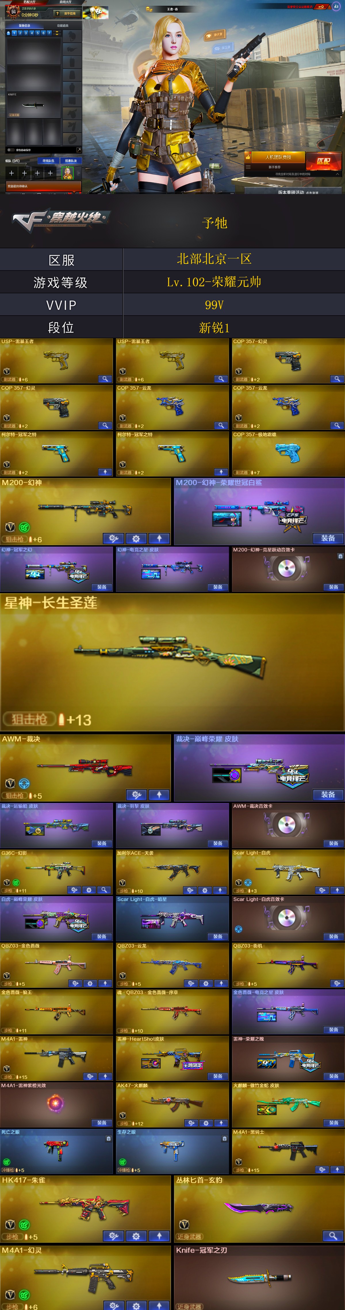 M200-幻神/G36C-幻影/ScarLight-白虎/HK417-朱雀/M4A1-幻灵/COP357-幻灵(2)/天神-动感闪耀/COP357-云龙(2)/柯尔特-冠军之特(2)/QBZ03-云龙/QBZ03-金色蔷薇/AK47-火麒麟(2)/M4A1-黑龙/M4A1-雷神/M4A1-黑骑士/Barrett-毁灭(2)/AWM-裁决/幻灵之锋(2) 【王者武器】: 【热门角色】:机械姬/影豹/奇洋探员/乔伊教练/蛇隐宗/王者春/灵狐者-职业经理/潘多拉-X/兔囡囡/潘多拉 【热门音效卡】:AWM-裁决音效卡/Scar Light-白虎音效卡/M4A1-黑骑士音效卡 【热门皮肤】:M200-幻神-荣耀世冠白鲨/幻神-冠军之幻/裁决-巅峰荣耀皮肤/雷神-HeartShot皮肤/屠龙-星耀皮肤/火麒麟-傲竹金蛇皮肤/裁决-羽掣皮肤/白虎-巅峰荣耀 皮肤/ScarLight-白虎-暗星/毁灭-荣耀之怒/屠龙-春桃皮肤/雷神-荣耀之魄 【其他亮点】:Knife-冠军之刃/贝雷塔687-射手座 (截图展示段位不代表实际段位,如赛季更新等不可抗拒因素发生变化,其余道具看截图或咨询客服);USP-雷暴王者,柯尔特-冠军之特,Knife-冠军之刃,QBZ03-金色蔷薇,G36C-幻影,M200-幻神,Scar Light-白虎,