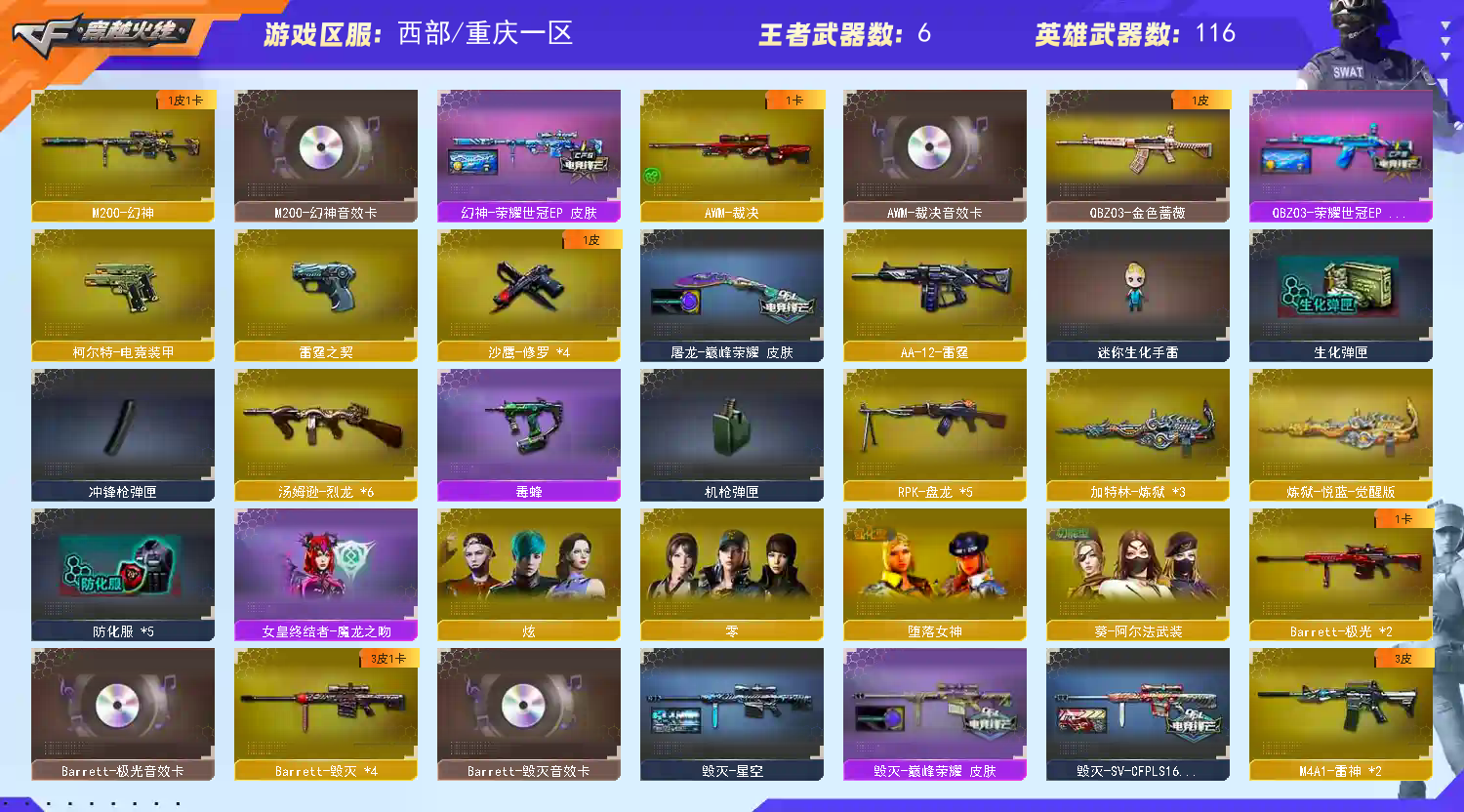 【M200-幻神+音效卡】【m200竞技荣光】【5盘龙 炼狱*4 6烈龙 死亡之眼 】【QBZ03-金色蔷薇】【hk417朱雀】【火麒麟+卡】【雷神+白鲨冠军+冠军之魄】【黑骑士+卡+冠军之势】【毁灭+卡】【极光+卡】【裁决 +卡】【武器:雷霆 海王 白虎电玩 王者森决】【7手枪:修罗*4 天神*2 雷霆 电竞装甲】【10刀具:屠龙*5 龙啸 擎天 尼泊尔雷霆 竞技荣光 】【8雷套:雷霆雷*7 堕天神雷】【小人枪:天龙曼陀罗 】【音效卡:毁灭音效卡 幻神音效卡 裁决音效卡 极光音效卡 黑骑士音效卡 火麒麟音效卡 】【角色:零 炫 堕落女神 】;RPK-盘龙,QBZ03-金色蔷薇,M200-幻神,