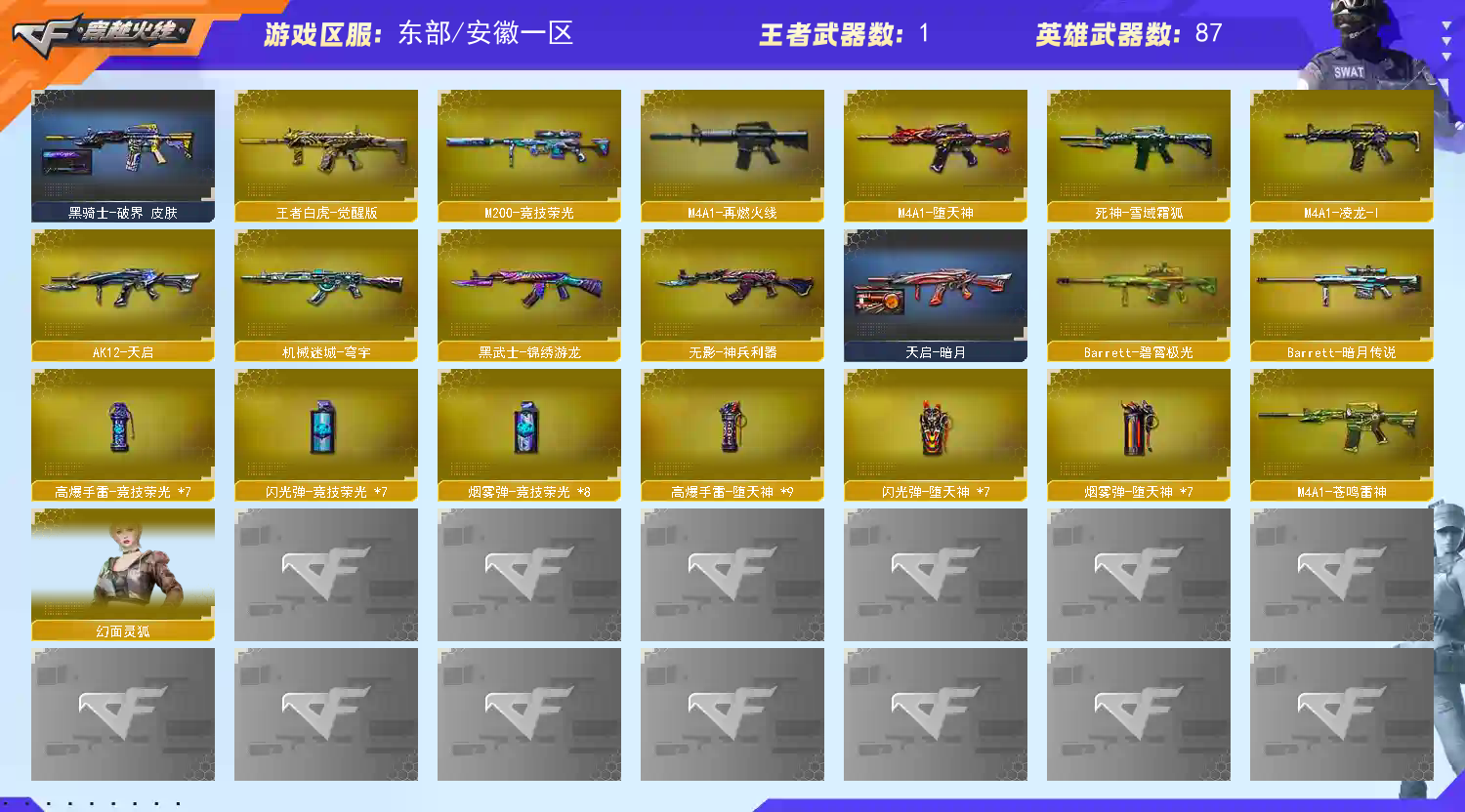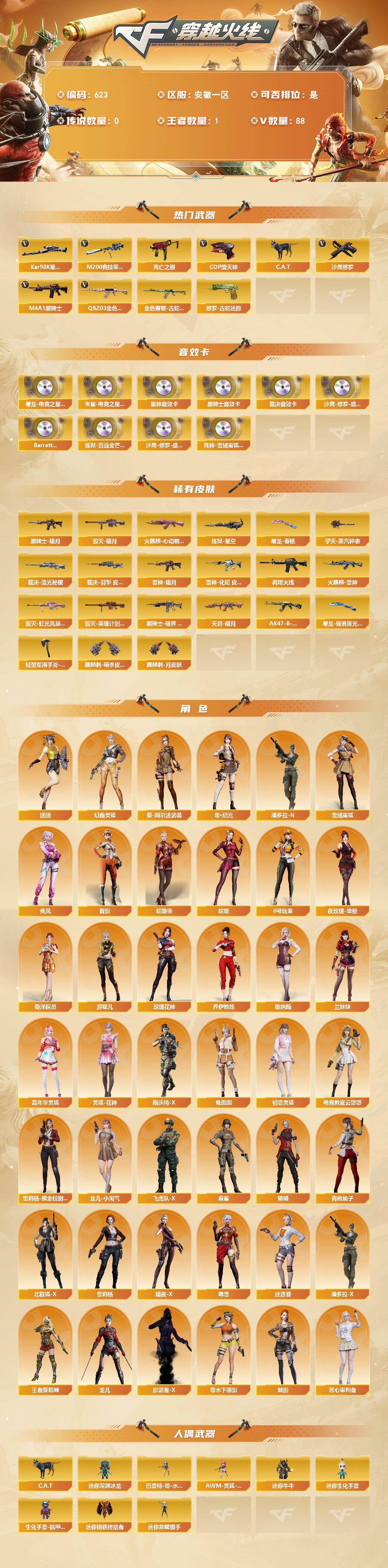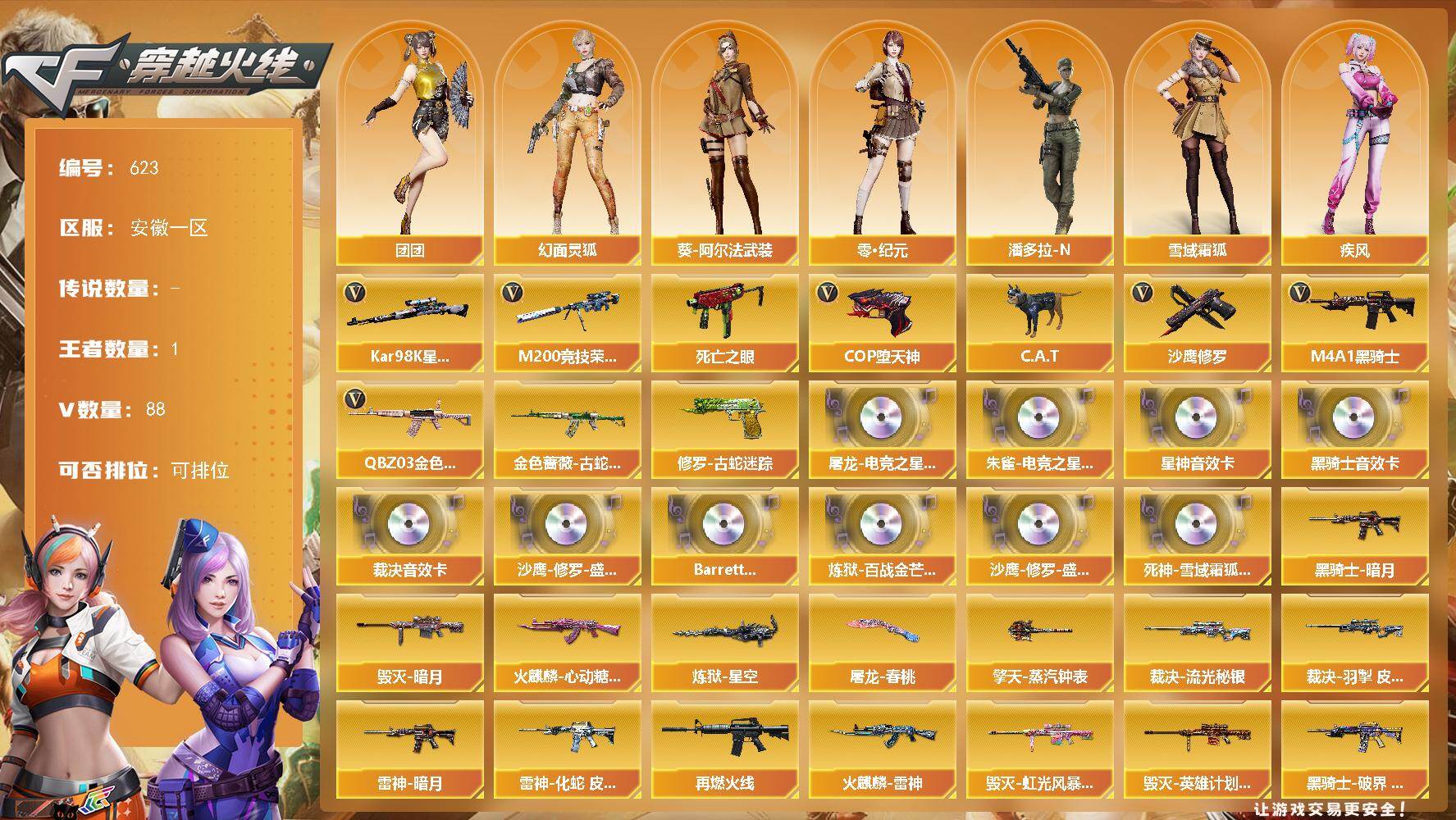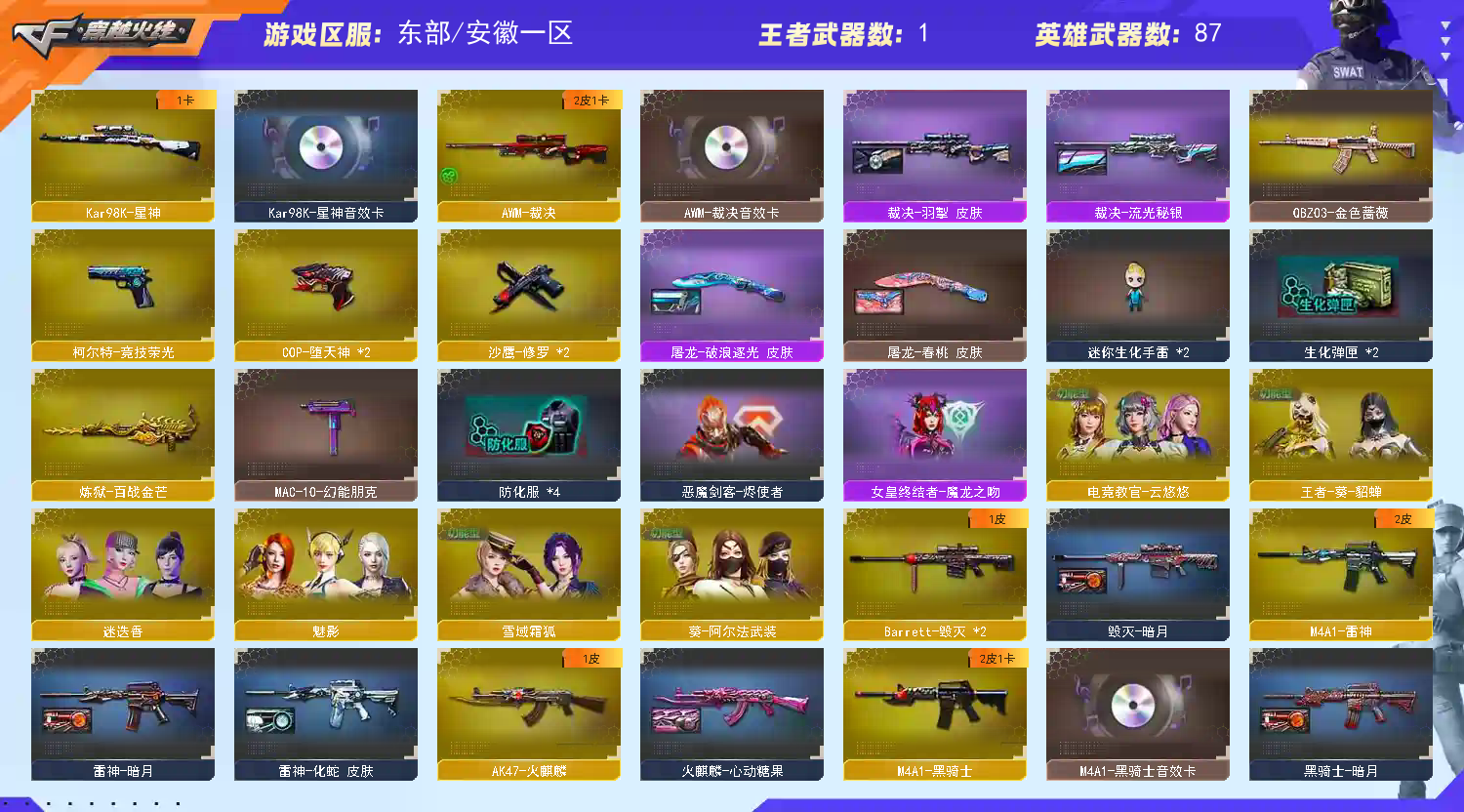 【热门武器】:QBZ03-金色蔷薇,金色蔷薇-古蛇迷踪,修罗-古蛇迷踪,M200-竞技荣光,死亡之眼,Kar98K-星神,C.A.T,M4A1-黑骑士,COP-堕天神*2,沙鹰-修罗*2 【音效卡】:Kar98K-星神音效卡,屠龙-电竞之星-竞星跃动音效卡,M4A1-黑骑士音效卡,AWM-裁决音效卡,HK417-朱雀-电竞之星-竞星跃动音效卡,沙鹰-修罗-盛典舞曲音效卡*2,Barrett-碧霄极光音效卡,炼狱-百战金芒-庆典舞曲音效卡,死神-雪域霜狐-怀旧音效卡 【皮肤】:裁决-流光秘银,裁决-羽掣 皮肤,雷神-暗月,雷神-化蛇 皮肤,M4A1-再燃火线,炼狱-星空,火麒麟-雷神,火麒麟-心动糖果,毁灭-暗月,毁灭-虹光风暴 皮肤,毁灭-英雄计划 皮肤,黑骑士-暗月,黑骑士-破界 皮肤,天启-暗月,AK47-B-常胜将军-孙权,屠龙-春桃 皮肤,屠龙-破浪逐光 皮肤,轻型军用手斧-再燃火线,擎天-蒸汽钟表 皮肤,麒麟刺-萌杀皮肤,麒麟刺-月皮肤 【角色】:魅影,迷迭香,电竞教官-云悠悠,零·纪元,王者-葵-貂蝉,雪域霜狐,蛇隐宗,奇洋探员,乔伊教练,葵-阿尔法武装,幻面灵狐,暗夜-X,北极狐-X,初恋灵狐,芳心审判者,飞虎队-X,嘉年华灵狐,疾风,娟娟,兰妹妹,0号玩家,零-水下丽影,灵狐-花神,龙儿,龙儿-小淘气,麻雀,玫瑰花神,潘多拉-X,青霞仙子,蛇姬,斯沃特-X,蜀雪,兔囡囡,维纳斯,雪莉杨,雪莉杨-摸金校尉,夜玫瑰-宠粉,影武者-X,游珑儿,智影,潘多拉-N,团团 【人偶武器】:迷你钢铁终结者,迷你救赎猎手*2,巴雷特-零-水下丽影,AWM-灵狐-15周年嘉年华*2,C.A.T,迷你深渊冰龙,迷你牛牛,迷你生化手雷*2,生化手雷-机甲核心*3 【暴走生化】:双面神-竞魂,死亡之眼,超级对讲机 【挑战大师】:冰龙粉碎者-白马银枪,激光毁灭者III 【英雄级武器】:AK47-火麒麟,M4A1-雷神,M4A1-黑骑士,AK12-天启,M4A1-堕天神,QBZ03-金色蔷薇,无影-神兵利器,黑武士-锦绣游龙,金色蔷薇-古蛇迷踪,死神-雪域霜狐,王者白虎-觉醒版,HK417-朱雀-电竞之星,机械迷城-穹宇,Barrett-毁灭*2,AWM-裁决,Kar98K-星神,M200-竞技荣光,Barrett-暗月传说,炼狱-百战金芒,沙鹰-修罗*2,沙鹰-天神,COP-堕天神*2,柯尔特-竞技荣光,修罗-古蛇迷踪,屠龙*4,麒麟刺-堕天神,擎天,麒麟刺,擎天-竞技荣光,龙啸-堕天神,麒麟刺-百战金芒,屠龙-电竞之星,高爆手雷-堕天神*9,高爆手雷-竞技荣光*7,高爆手雷-古蛇迷踪,闪光弹-堕天神*7,闪光弹-竞技荣光*7,烟雾弹-堕天神*7,烟雾弹-竞技荣光*8,烟雾弹-古蛇迷踪,M4A1-赤狱骑士,M4A1-苍鸣雷神,AK47-竞魂无影,Barrett-碧霄极光 【其他武器】:火麒麟-雷神,源·雷神,M4A1-青龙-掌上穿越火线,金色蔷薇-狼王,QBZ03-文殊坊*2,魂·龙啸-秦师 【道具】:BS战队炫彩背包,CFS限定背包,云山科技背包,亚洲杯纪念炫彩背包,古蛇迷踪炫彩背包,奇洋探员-海龟背包,战舰背包,炫彩背包-诺拉,百战金芒炫彩背包,超级背包,雪域霜狐炫彩背包,女皇终结者-魔龙之吻,救世主-黑桃战神,恶魔剑客-烬使者,黄金生化钩,绿色巨人,灵魂忍者*3,变异宝贝,妖姬*2,迷雾幽灵*2,疯狂宝贝*3,生化弹匣*2,夺命之镰*2,防化服*4,流光-鎏金之域,枪王排位29赛季金色流光,语音特效-盛典烟火,语音特效-怀旧,古蛇迷特效,雪域霜狐表情,蛇隐宗表情,萌萌小葵表情,EP战队名片,EP战队喷图,EP战队击杀图标,防弹头盔*4,防弹衣*3,C4工具钳*3,手雷包*3 【特殊枪械】:1黑骑士;电竞教官-云悠悠,QBZ03-金色蔷薇,Kar98K-星神,