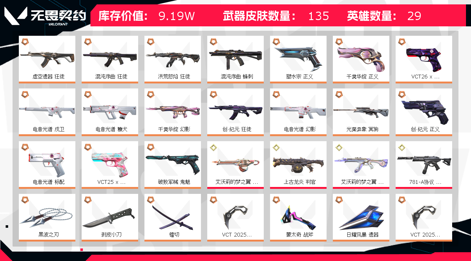 首页 > 租号大厅 > 无畏契约-wegame > wegame/wegame > 禁炸鱼9.5万库存⚡电音光谱套⚡掠夺3.0套⚡25+26vct绝版刀⚡黑波加剥皮刀⚡