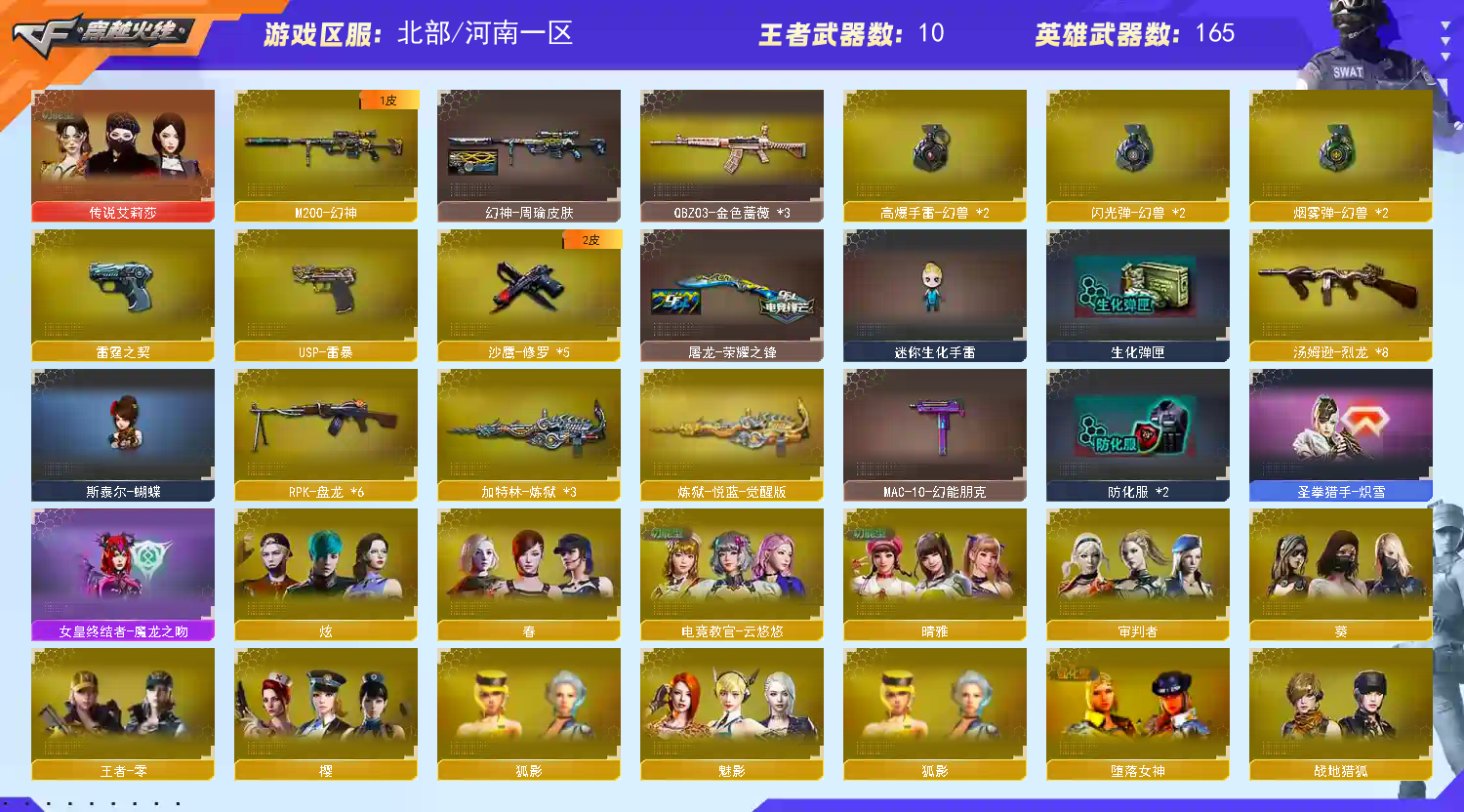 祝您游戏愉快!!!生活愉快!!!;USP-雷暴,电竞教官-云悠悠,晴雅,传说艾莉莎,RPK-盘龙,QBZ03-金色蔷薇,M200-幻神,