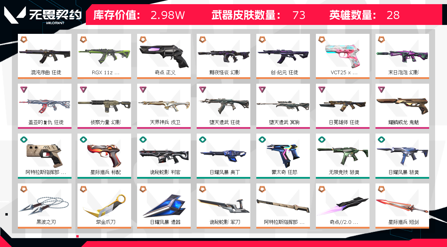 允许排位 英雄28 武器皮肤数量73 现超凡历史神话号 🚫开挂;黑波之刃,紫金爪刀,盖亚的复仇 狂徒,侦察力量 幻影,RGX 11z Pro 狂徒,天界神兵 戍卫,堕天遗武 狂徒,