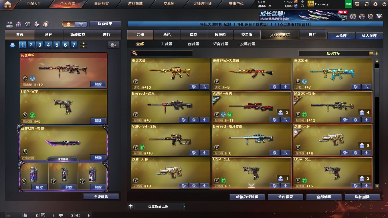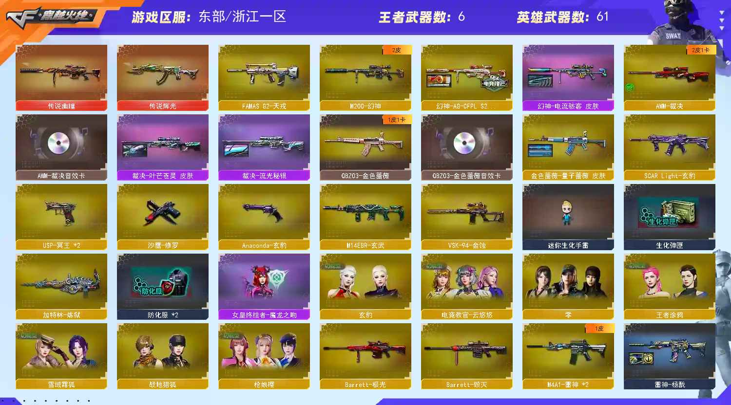 【传说幽瞳】【传说辉光】【M200 - 幻神 + 幻神 - 电流骇客皮肤 + 幻神 - AG-CFPL S24 冠军皮肤】【AWM - 裁决 + 裁决 - 叶芒苍灵皮肤 + 裁决 - 流光秘银 + AWM - 裁决音效卡】【USP - 冥王 (2)】【QBZ03 - 金色蔷薇 + 金色蔷薇 - 量子蔷薇皮肤 + QBZ03 - 金色蔷薇音效卡】【VSK-94 - 金蚀】【M4A1 - 雷神 (2)+ 雷神 - 源计划 2.0 专属皮肤 + 雷神 - 白鲨皮肤 + 雷神 - 杨戬 + 雷神 - HeartShot 皮肤】【AK47 - 火麒麟 + 荣耀世冠 - 火麒麟 + 火麒麟 - CFSTAR + 火麒麟 - 枪娘凯特琳 + 火麒麟 - 盘古】【Barrett - 毁灭】【M4A1 - 黑骑士 + 黑骑士 - 电玩青兔皮肤 + M4A1 - 黑骑士音效卡】【电竞教官 - 云悠悠 / 枪娘樱 / 战地猎狐 / 玄豹 / 王者涂鸦 / 雪域霜狐 / 疾风 / 精英部队 - X / 夜玫瑰 - N / 幽】【Barrett - 暗月传说 / 王者火魄 - 觉醒版 / SCAR Light - 玄豹 / FAMAS G2 - 天戎 / QBZ03 - 独角 - III / 沙鹰 - 天神 (2)/ 擎天 (2)/ 擎天 - 竞技荣光 / Anaconda - 玄豹 / 丛林匕首 - 玄豹 (5)】【KAC 锯式机枪 - 黑桃战神】【AWM - 天龙 - CFSTAR】【Scar Light - 白虎 - 暗星】【沙鹰 - 修罗 - CFSTAR】【沙鹰 - 天神 - 春花弄影皮肤】【死神 - 雪域霜狐 - 怀旧音效卡】;电竞教官-云悠悠,QBZ03-金色蔷薇,传说幽瞳,M200-幻神,