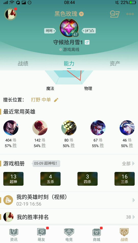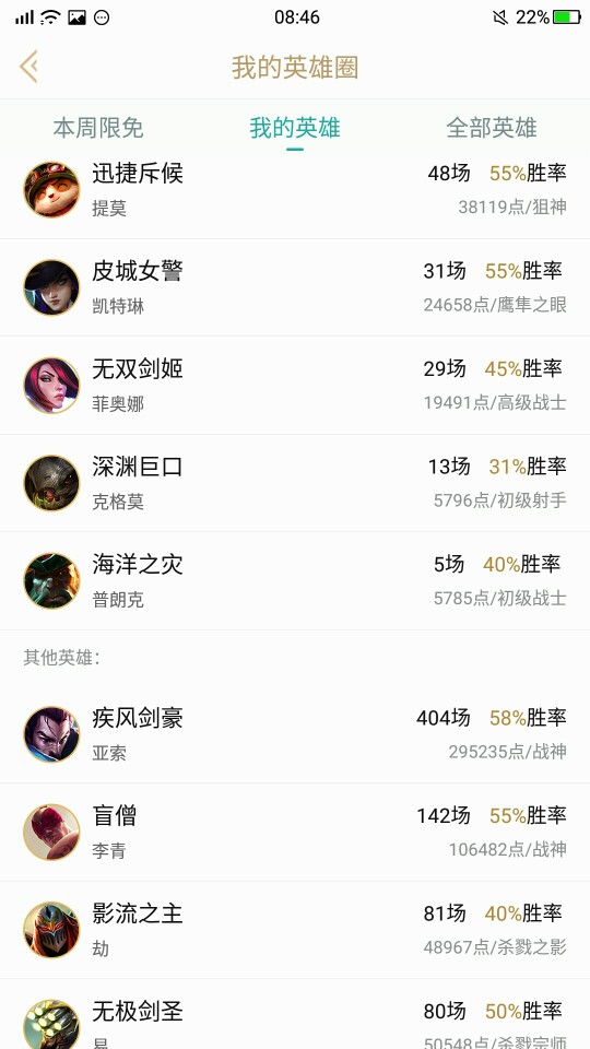 可以排位!欢迎高手来虐菜 但是请不要逃跑 不要逃跑 不要逃跑 我很难等20分钟哎惩罚 一个星期只需要40 等级100+ 英雄75 皮肤49 疾风剑豪400多场7级牌