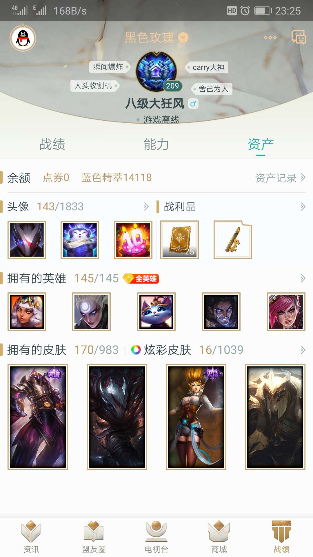黑色玫瑰 带妹优选号,赏我2块钱吧兄弟们!全英雄皮肤170个。(段友免费)