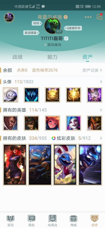 可排位弗雷尔334皮肤114英雄
