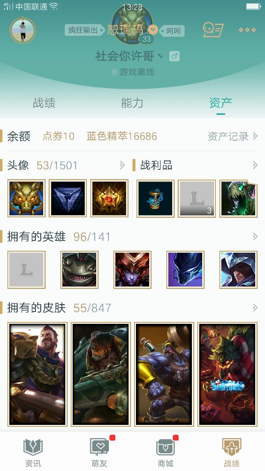坤少租号:恕瑞玛可打排位 各种限定皮肤 海克斯 冠军皮肤 冰雪节限定!