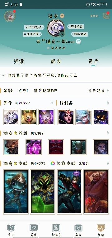 祖安 105英雄 140皮肤 皮肤还可以 武器大师skt SSW炼金 冰雪节4个 希望哥哥姐姐们给我留个英雄时刻我好看看
