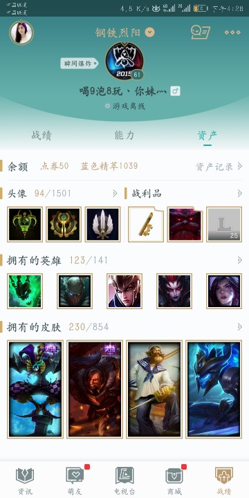 。钢铁烈阳。排位不限。皮肤230,英雄124