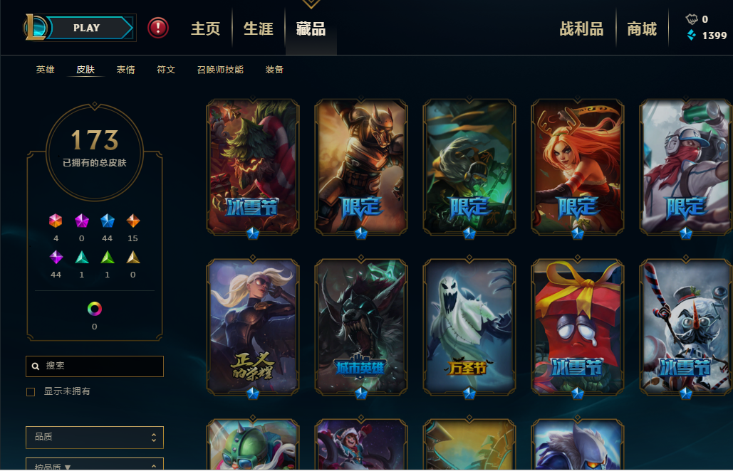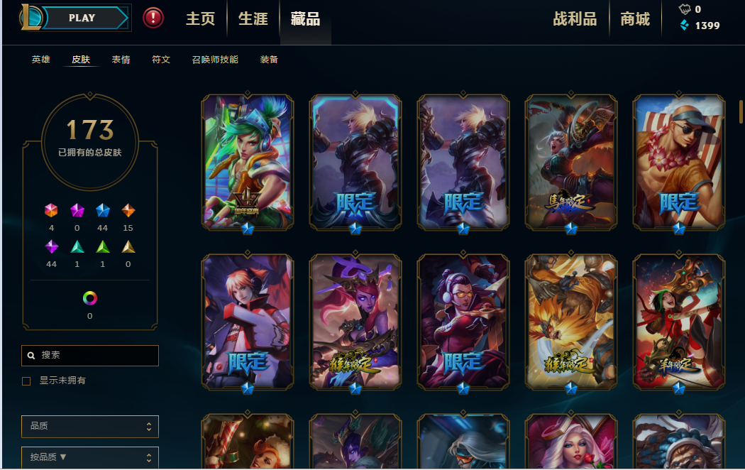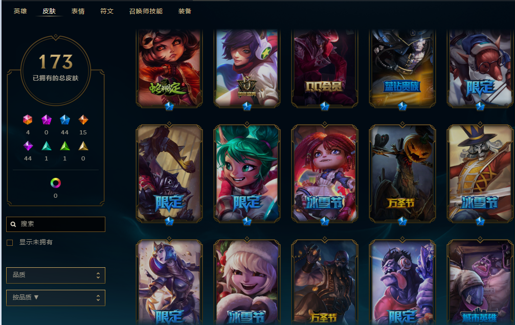 因为自己很少玩所以还是黄金号,100多个常用英雄,199皮肤有很多包括终极皮肤还有年限,各类冰雪节,万圣节限定,一般限定,还有4周年5周年限定等,史诗传说也很多,欢迎各位大神帮忙打打排位。