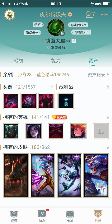 首页 > 租号大厅 > 撸阿撸 > 电信区/皮尔特沃夫 > 皮尔特沃夫141英雄,180皮肤几年没玩了当时买的都是喜欢的英雄皮肤