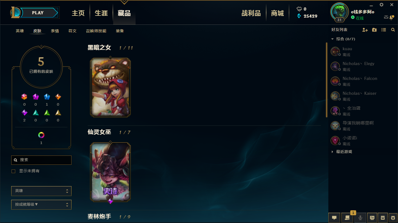 首页 > 租号大厅 > 英雄联盟 > 联盟一区/皮尔特沃夫 > 低价租低段位 34英雄 6皮肤 黄金5 皮肤有 露露驯龙女巫-安妮小红帽-小炮火箭达人-幽灵船长-胜利男枪