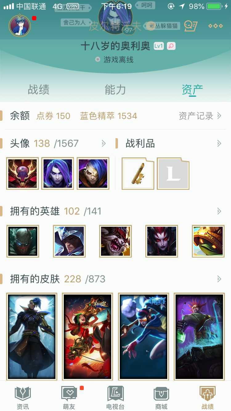 100+英雄 265皮肤 神龙烈焰 凯隐奥德赛 狗头年限 vn原计划 skt 终极皮服全都有 瑞文天使