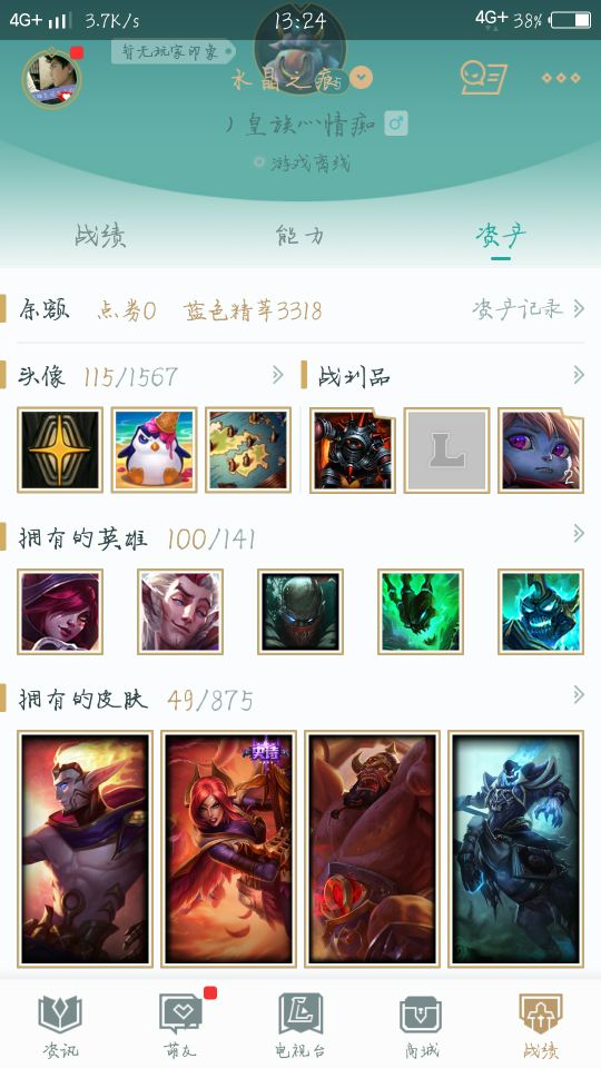 皮肤50个,英雄100个,随便怎么玩都可以,有冰雪限定,史诗级皮肤和传说级皮肤还有炫彩女警哦