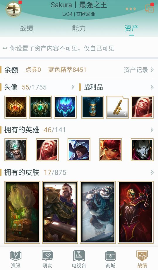 首页 > 租号大厅 > 英雄联盟 > 艾欧尼亚/艾欧尼亚 > 白金框,44英雄,17皮肤,号上有蓝色精粹,可自购