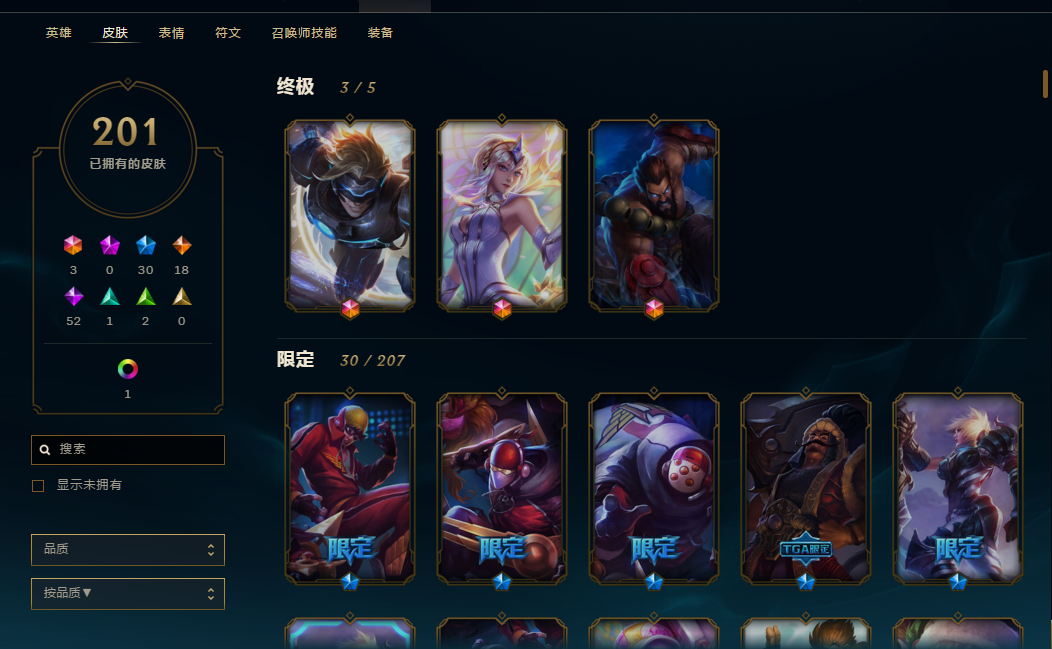 126个英雄201个皮肤。没怎么玩了,拿出来给大家玩玩...