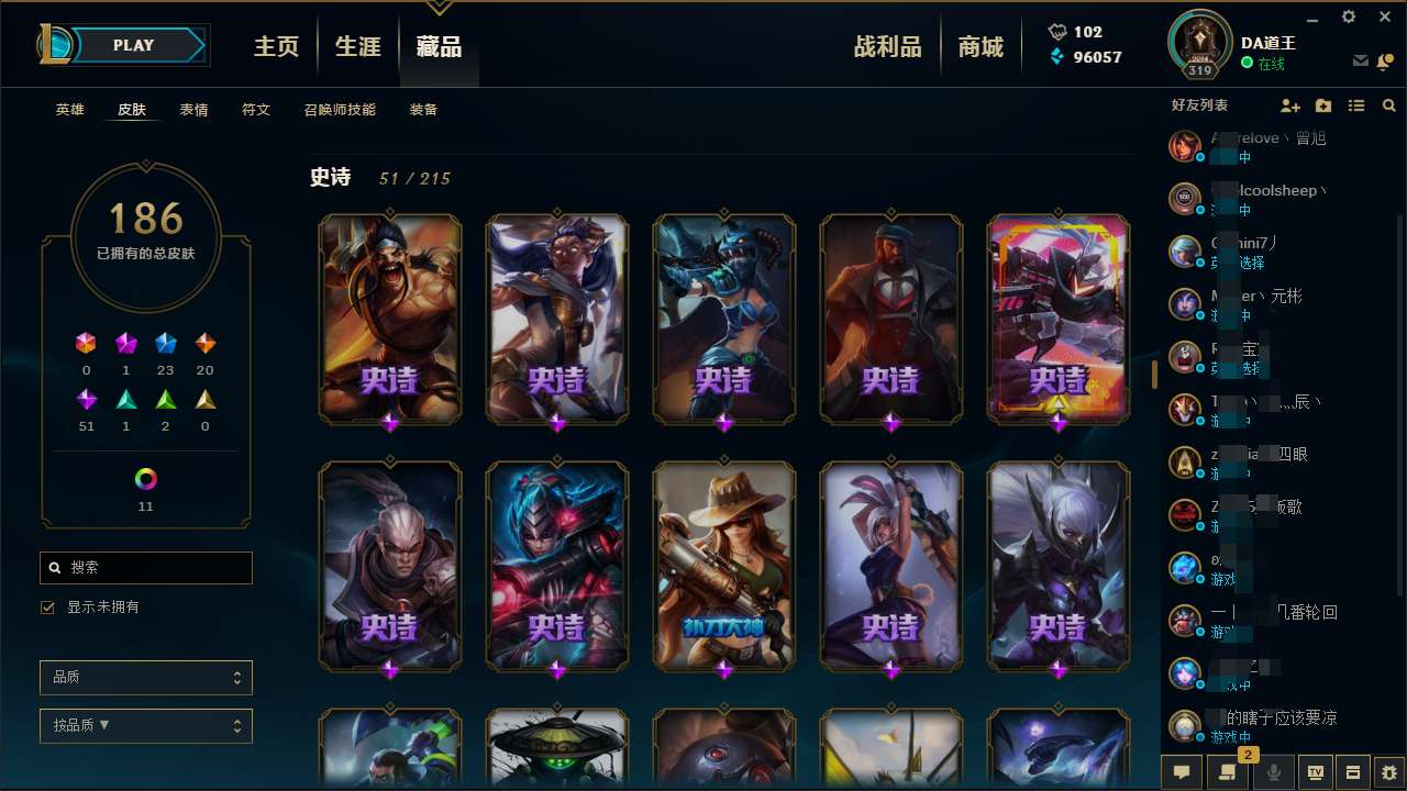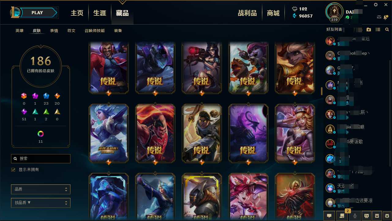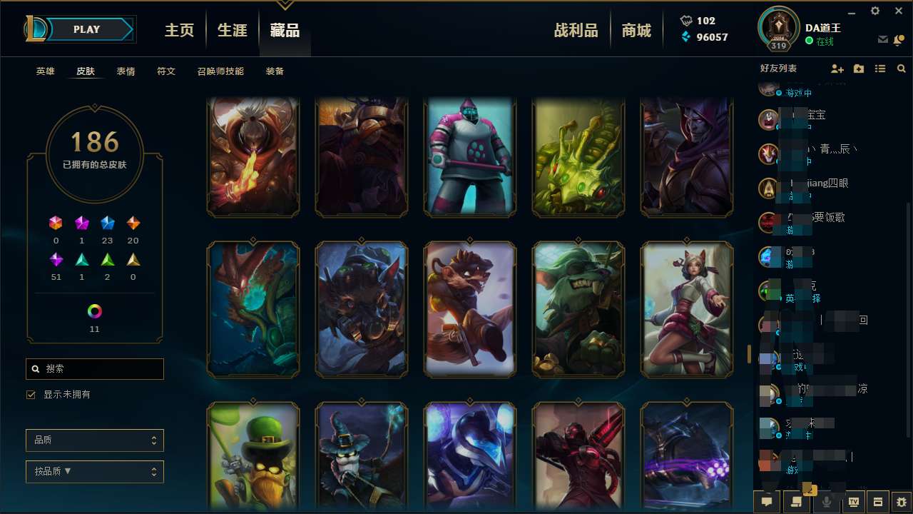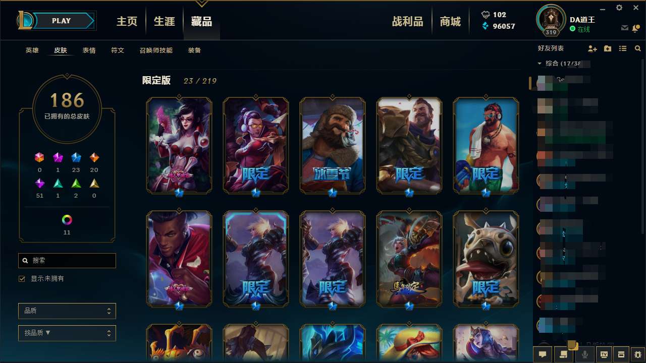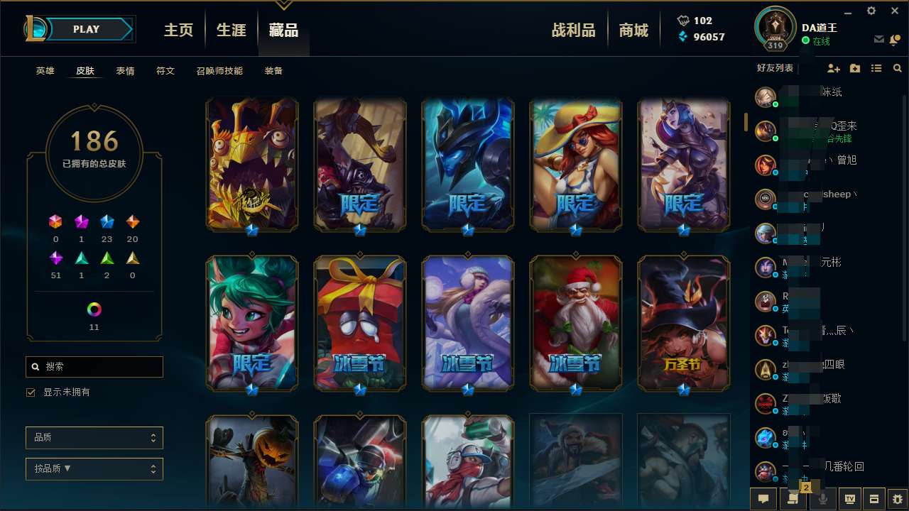首页 > 租号大厅 > 英雄联盟 > 联盟二区/暗影岛 > 全英雄 一百八 十几张皮肤 限定的还有点多,可以等进去看看皮肤如果感觉不行可以退订单 ,