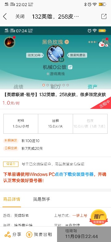 • 租号押金:0.0(订单结束后24小时退还)
