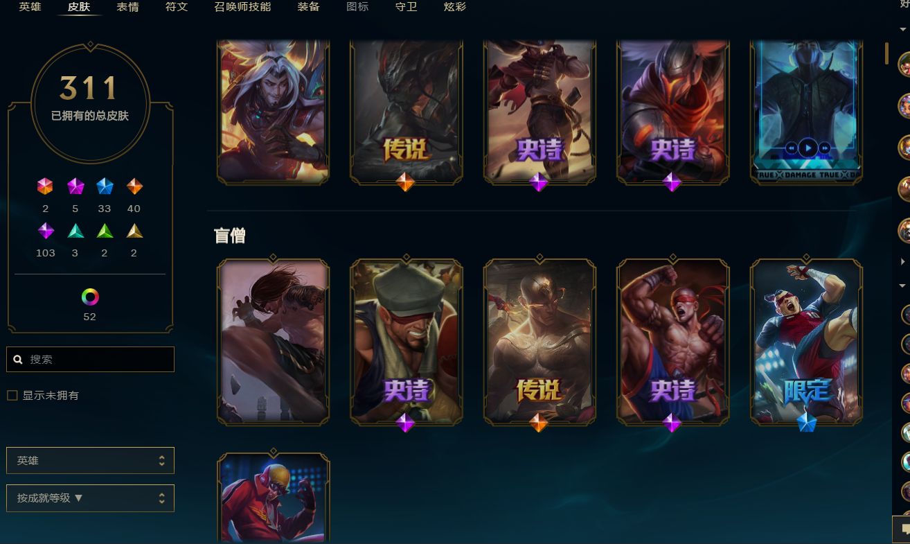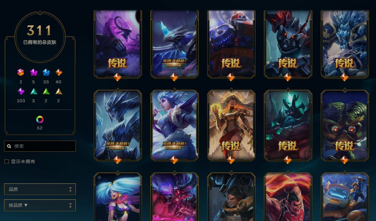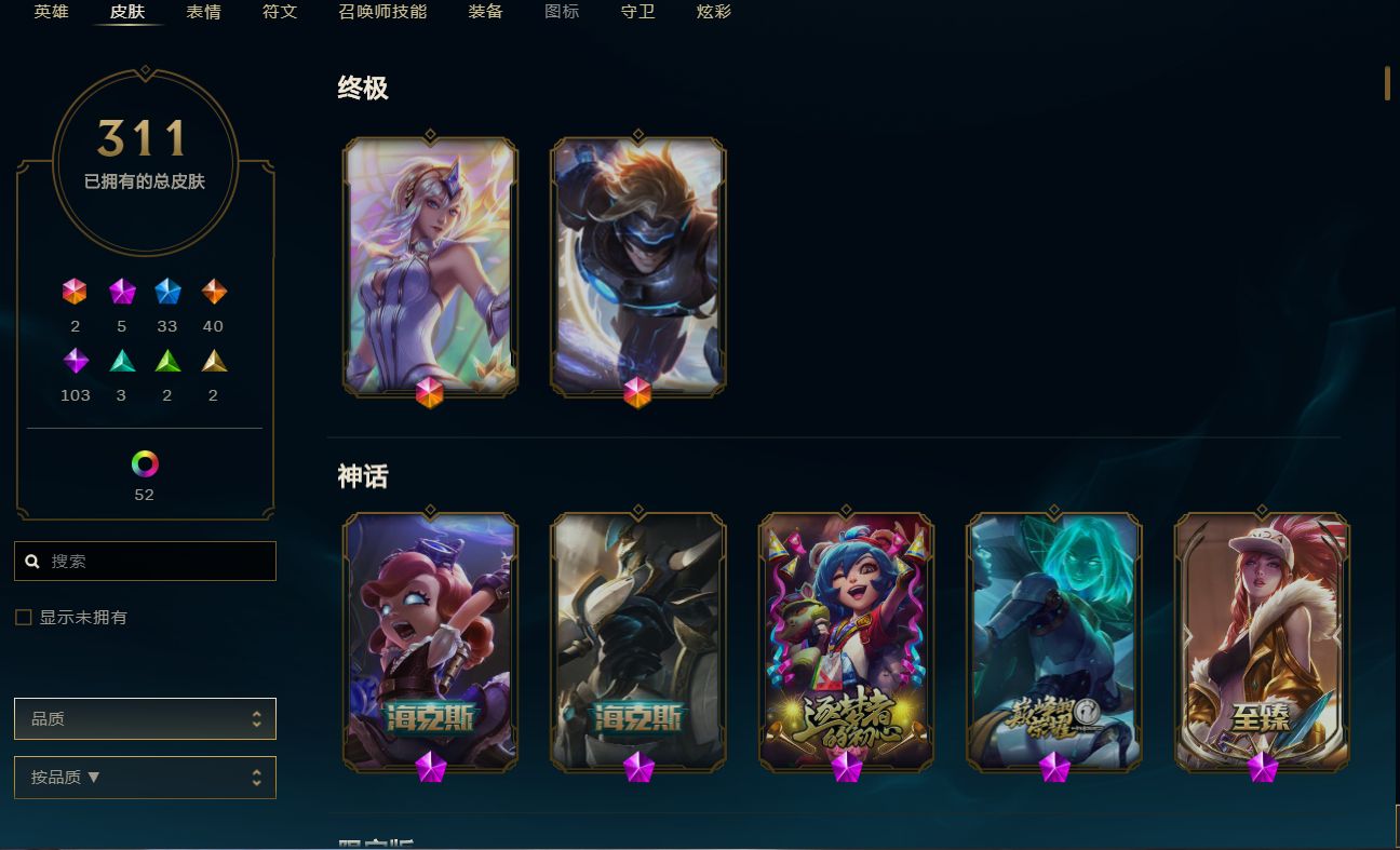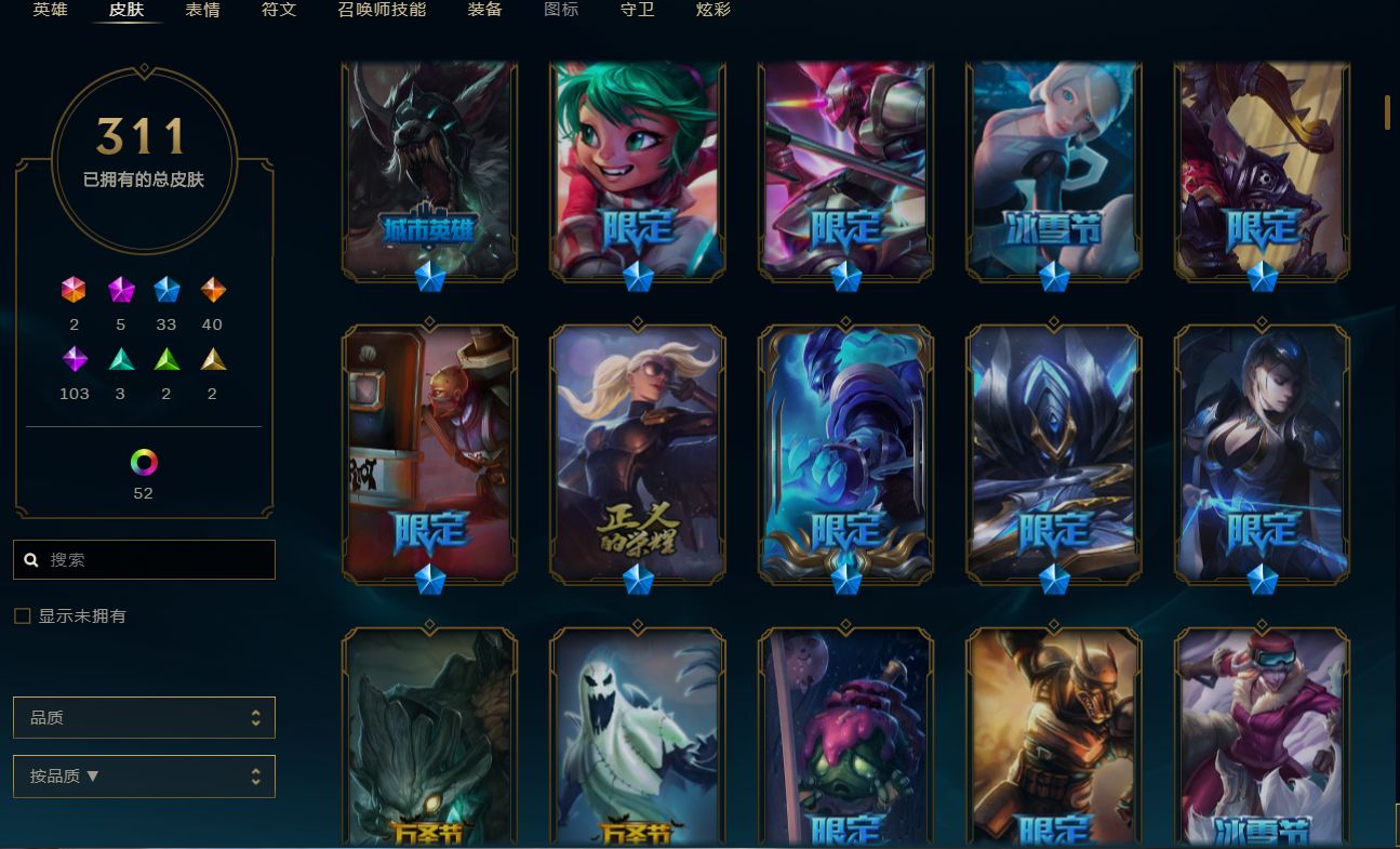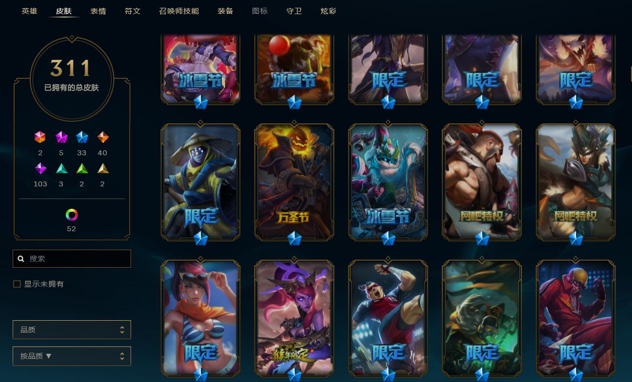 全英雄,311皮肤,海克斯安妮,1恐惧新星,至臻阿卡丽,8冰雪节,3万圣节,冠军IG螳螂,彩虹马