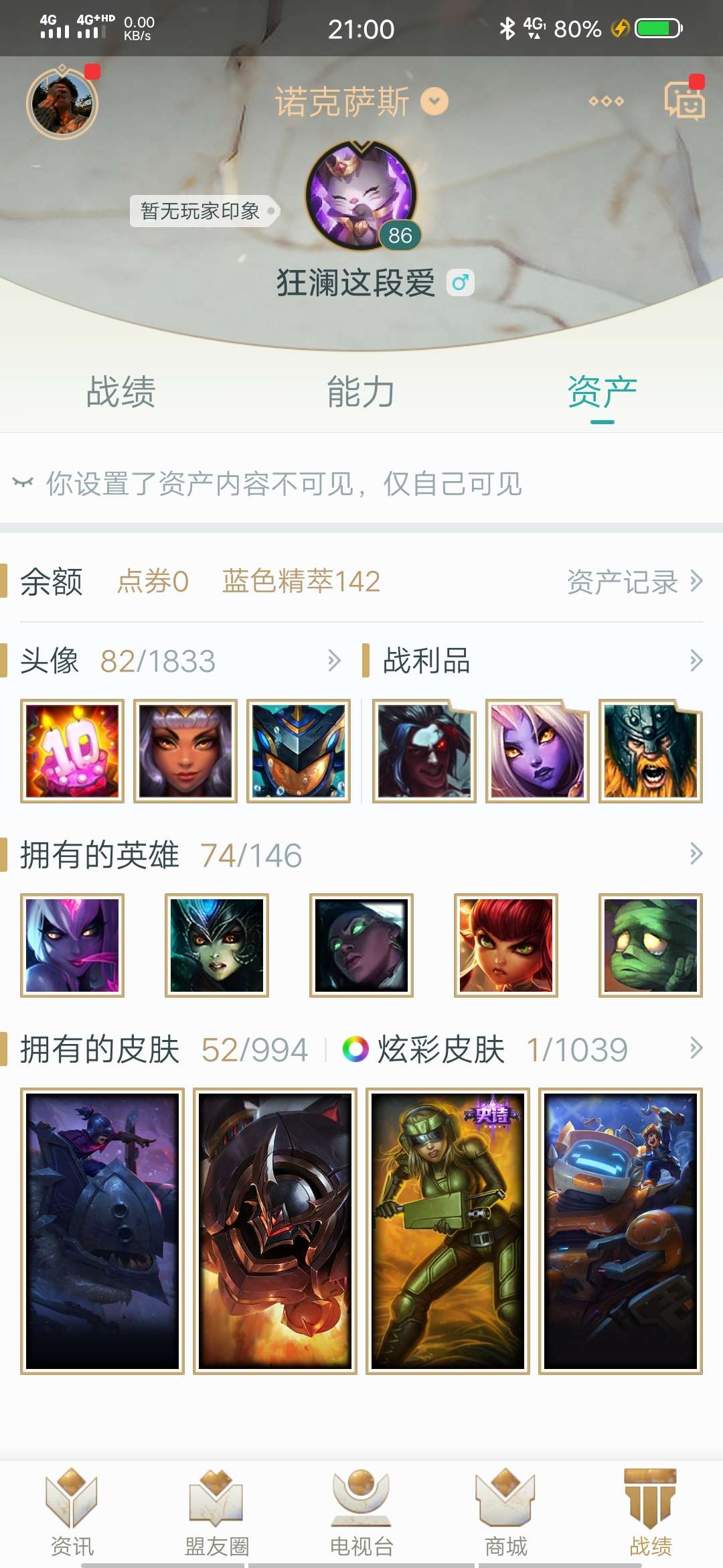 首页 > 租号大厅 > 英雄联盟 > 联盟二区/诺克萨斯 > 死歌fnc冠军皮肤,战地机甲,蒙多律政大亨,卡特猫女,天人合一,光辉地狱伞兵,努努合金巨兽!亚索西部