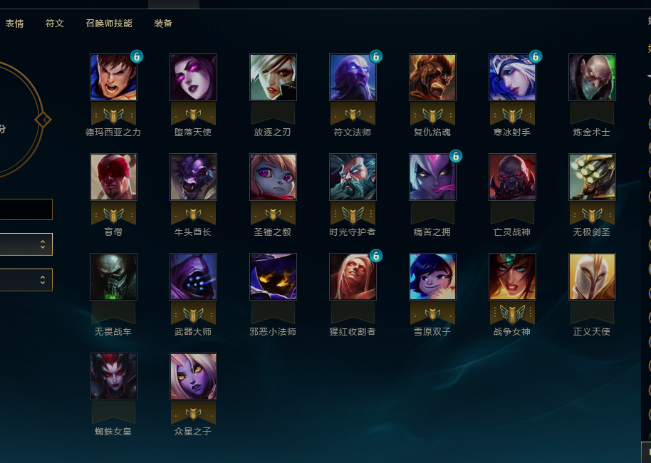 角色名:OccAii 英雄:无极剑圣 寒冰射手 德玛西亚之力 复仇焰魂 邪恶小法师 猩红收割者 武器大师 盲僧 战争女神 时光守护者 符文法师 雪原双子 亡灵战神 堕落天使 无畏战车 牛头酋长 痛苦之拥 众星之子 圣锤之毅 审判天使 炼金术士 蜘蛛