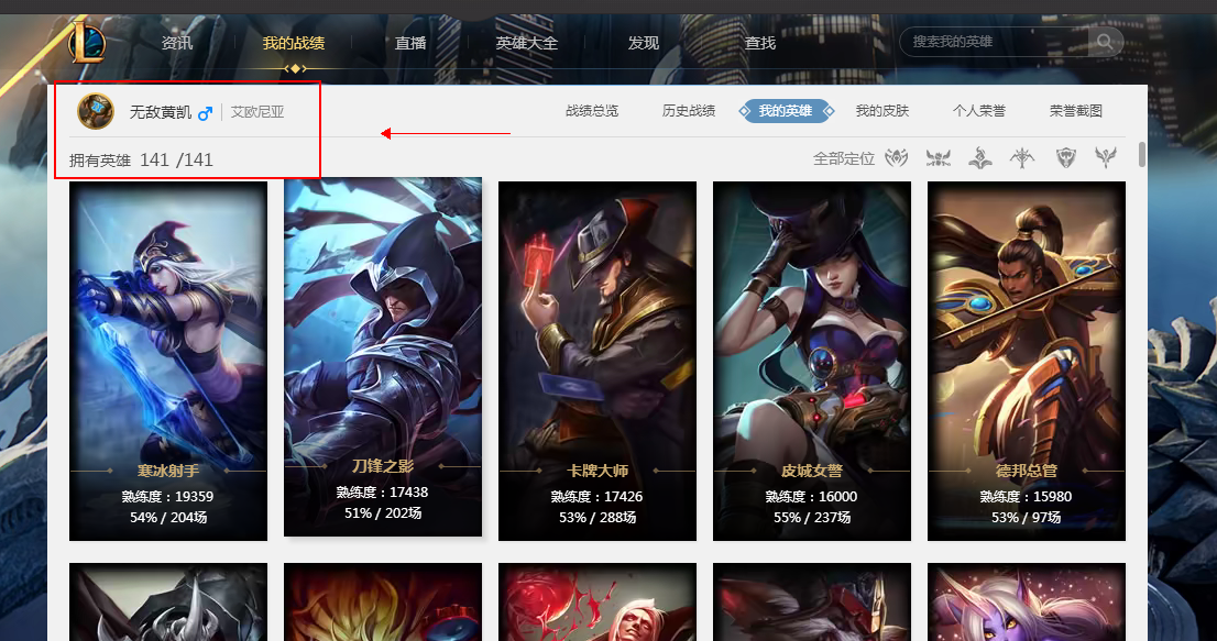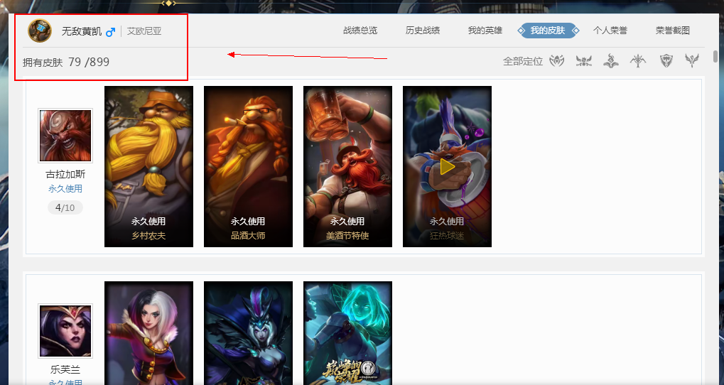 艾欧尼亚、全英雄、单双排黄金、s2青铜(老玩家)、79个皮肤