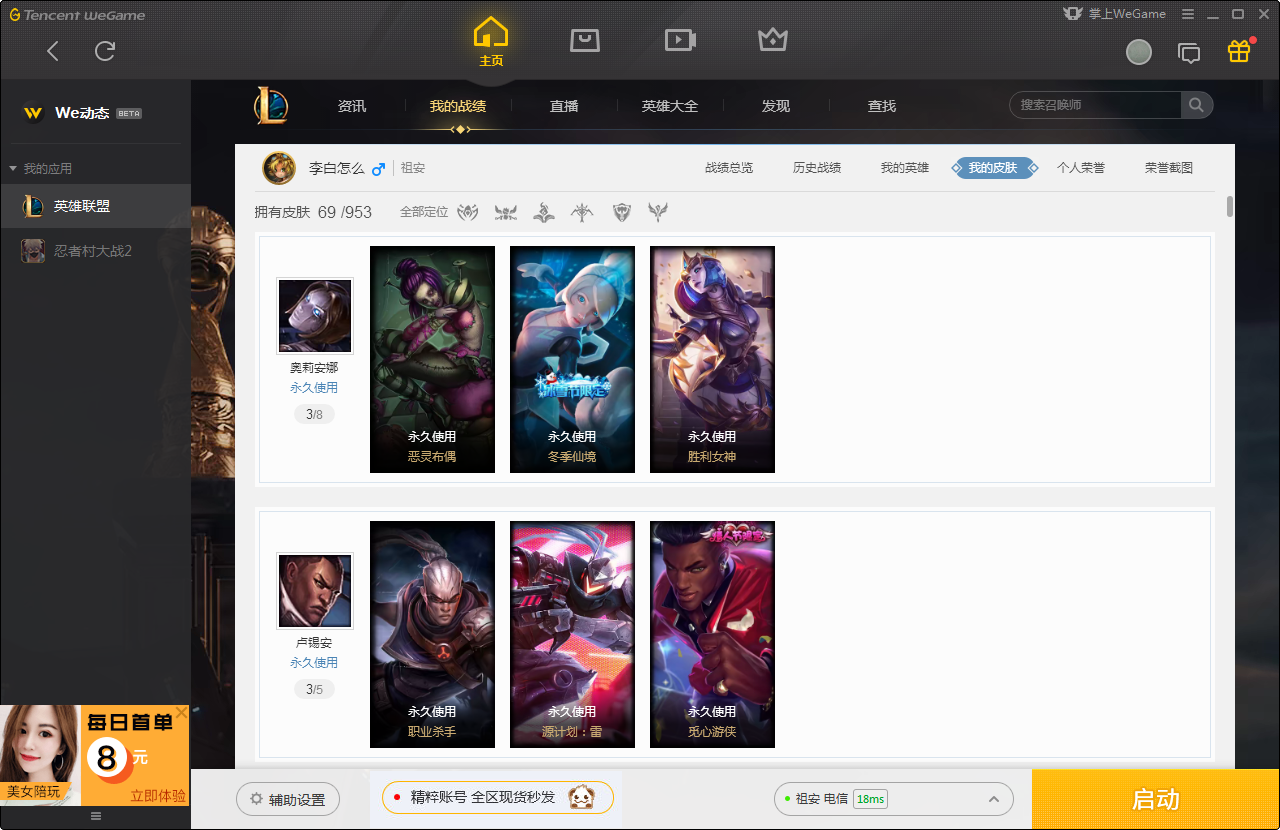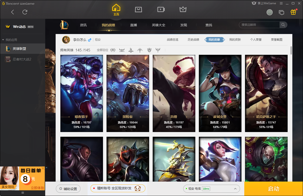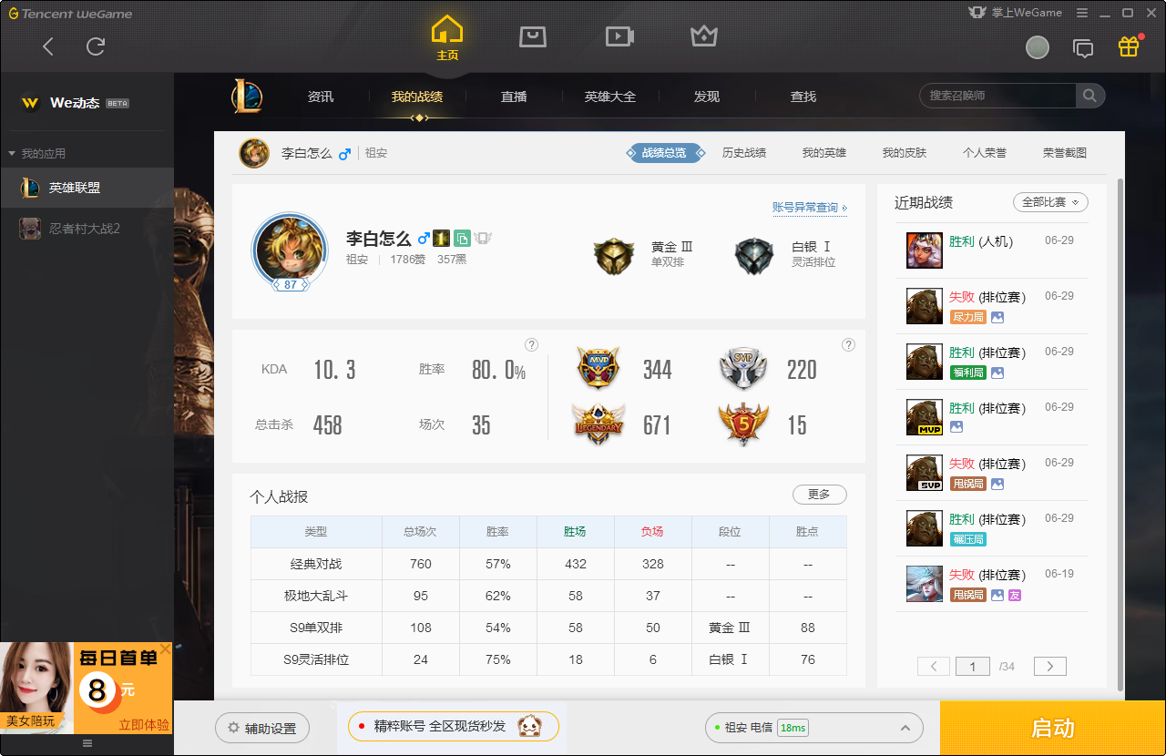 143个英雄,66个皮肤,段位因为租号原因会更新不及时