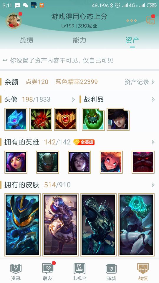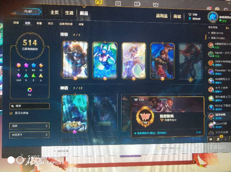 各种系列皮肤,全英雄,500+皮肤,等级400级,各种眼皮肤,大众段位,可排位!