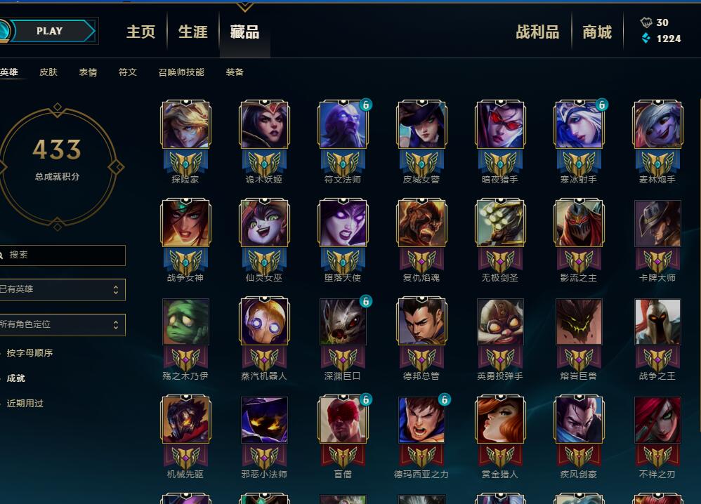 基本全英雄,皮肤几十个,你可以当作自己号玩,铂金框