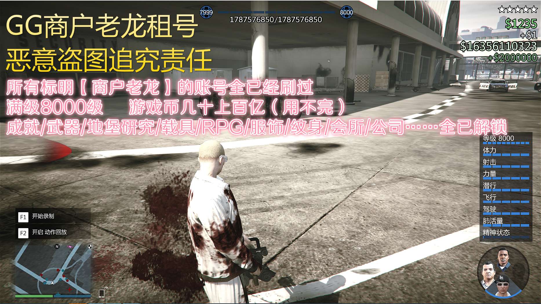 首页 > 租号大厅 > 侠盗猎车手Online > 全部区服/全部区服 > GG精选🔥商户老龙🔥GTA5线上满级8000级✅号内88.88个亿💲 所有能力武器载具全解锁✅