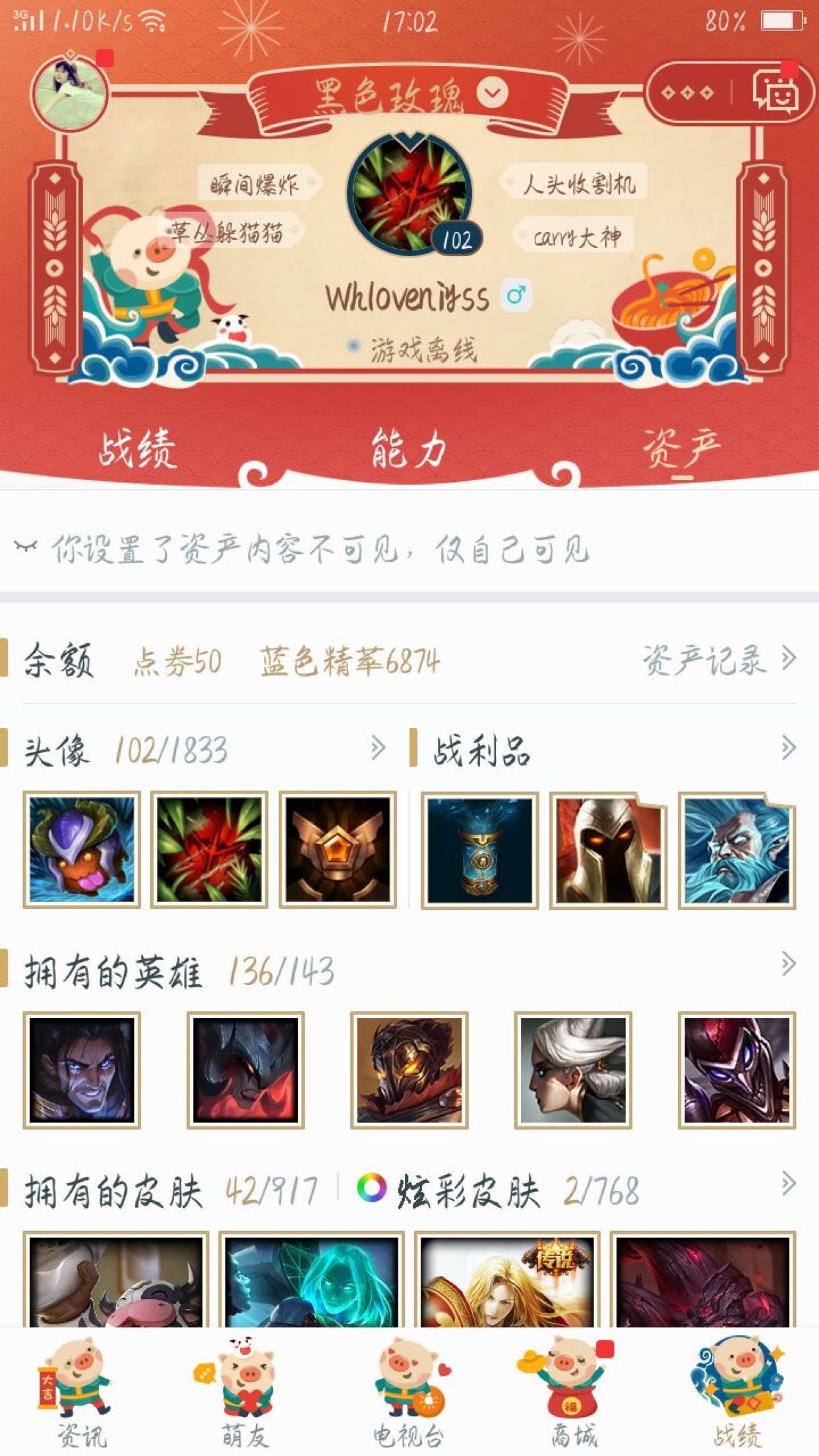 首页 > 租号大厅 > 英雄联盟 > 黑色玫瑰/黑色玫瑰 > 可以租了,黑色玫瑰妹子号,可语音好友一起玩,136英雄,赵云子龙,吕布44传说限定炫彩皮肤!
