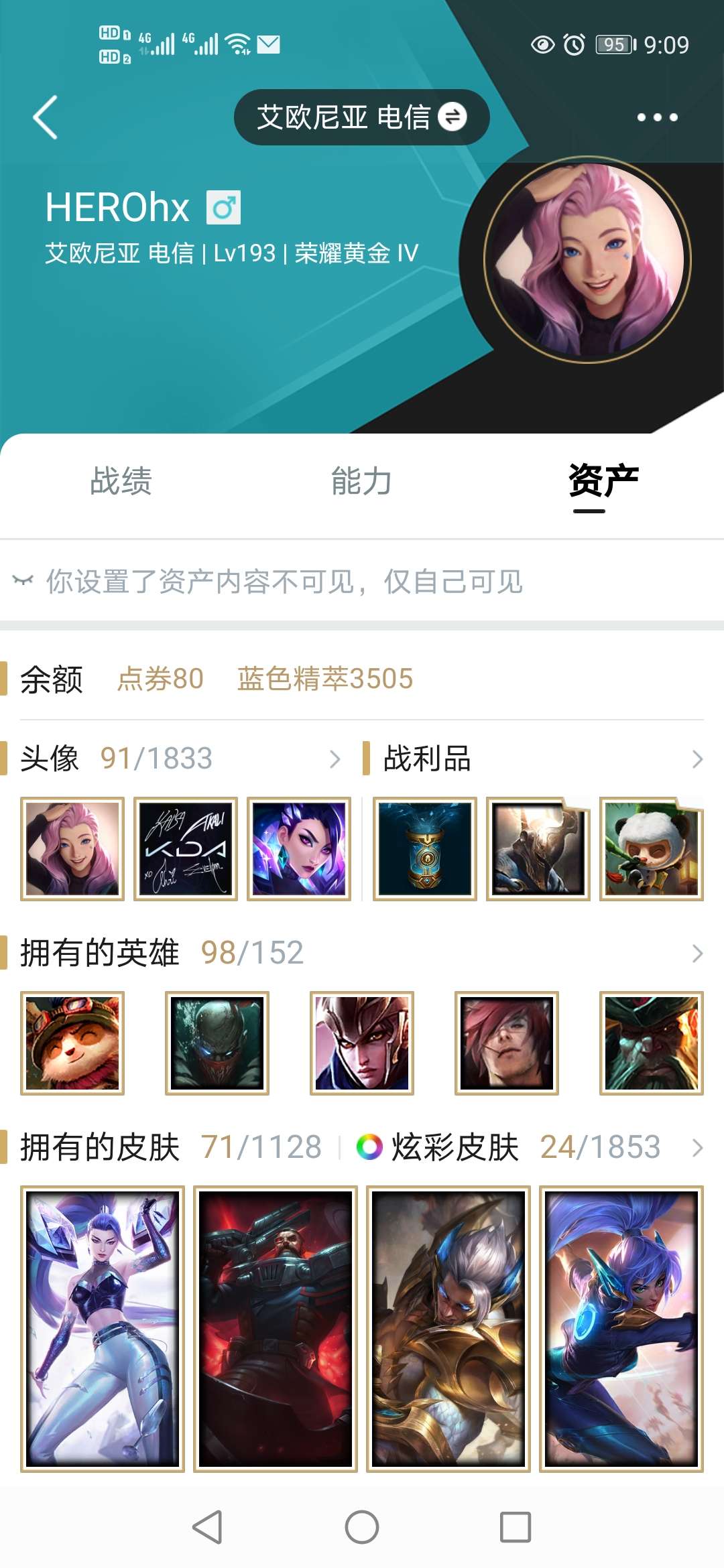 一区黄金号,开黑选择必备,热门英雄都有少量皮肤