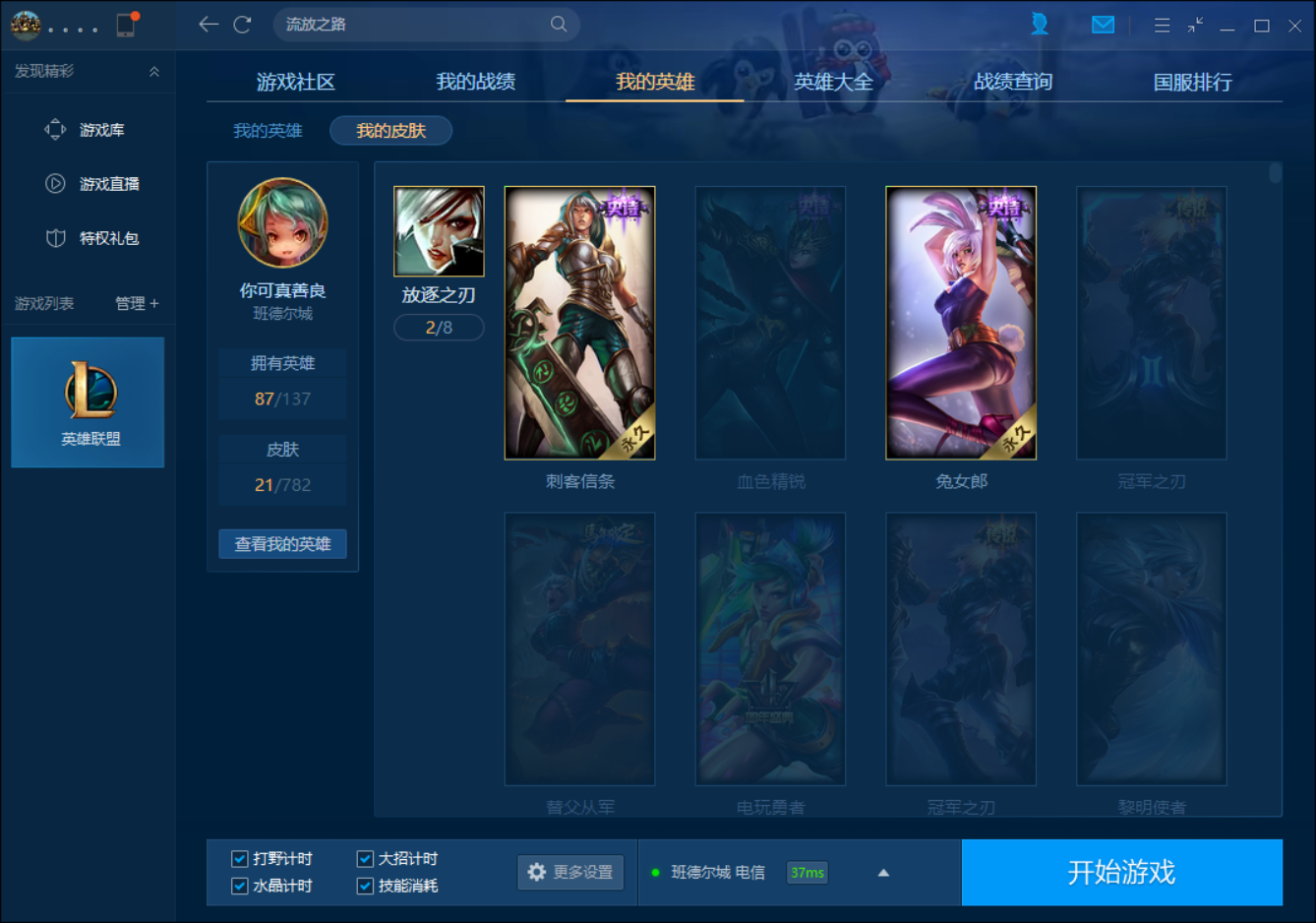 班德尔城 87英雄 21皮肤 黄金5锐雯,瞎子,鳄鱼皮肤等...