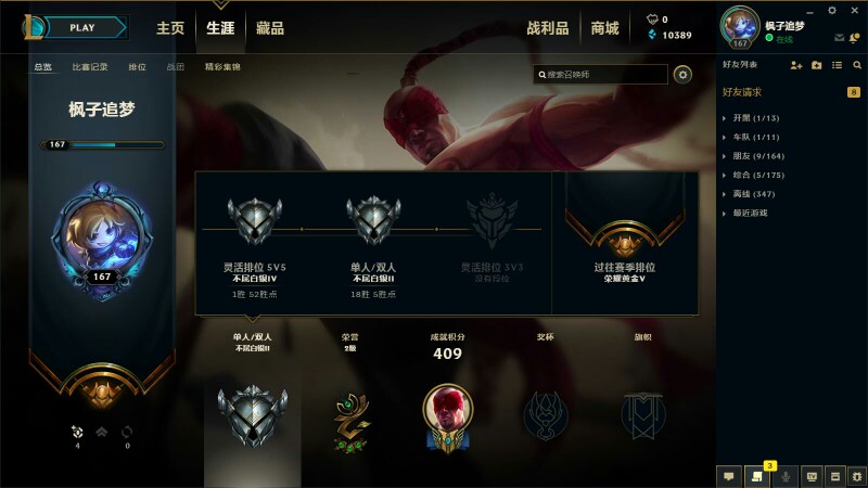 账号167级 127个英雄+131个皮肤,其中李青拥有七个皮肤,锐雯的未来战士,女警的未来战士,还有skt瑞兹的皮肤,克格莫大嘴的圣诞驯鹿等皮肤