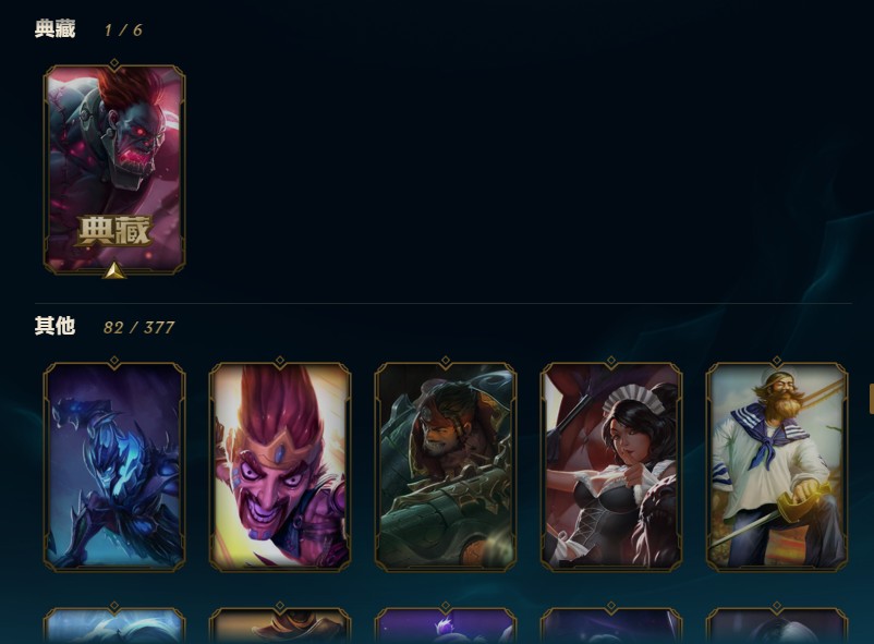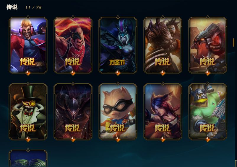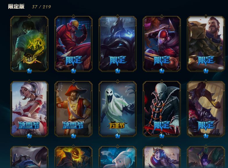 全英雄,基本上每个英雄都有皮肤,皮肤189个,100左右限定,很多年限,有龙虾。