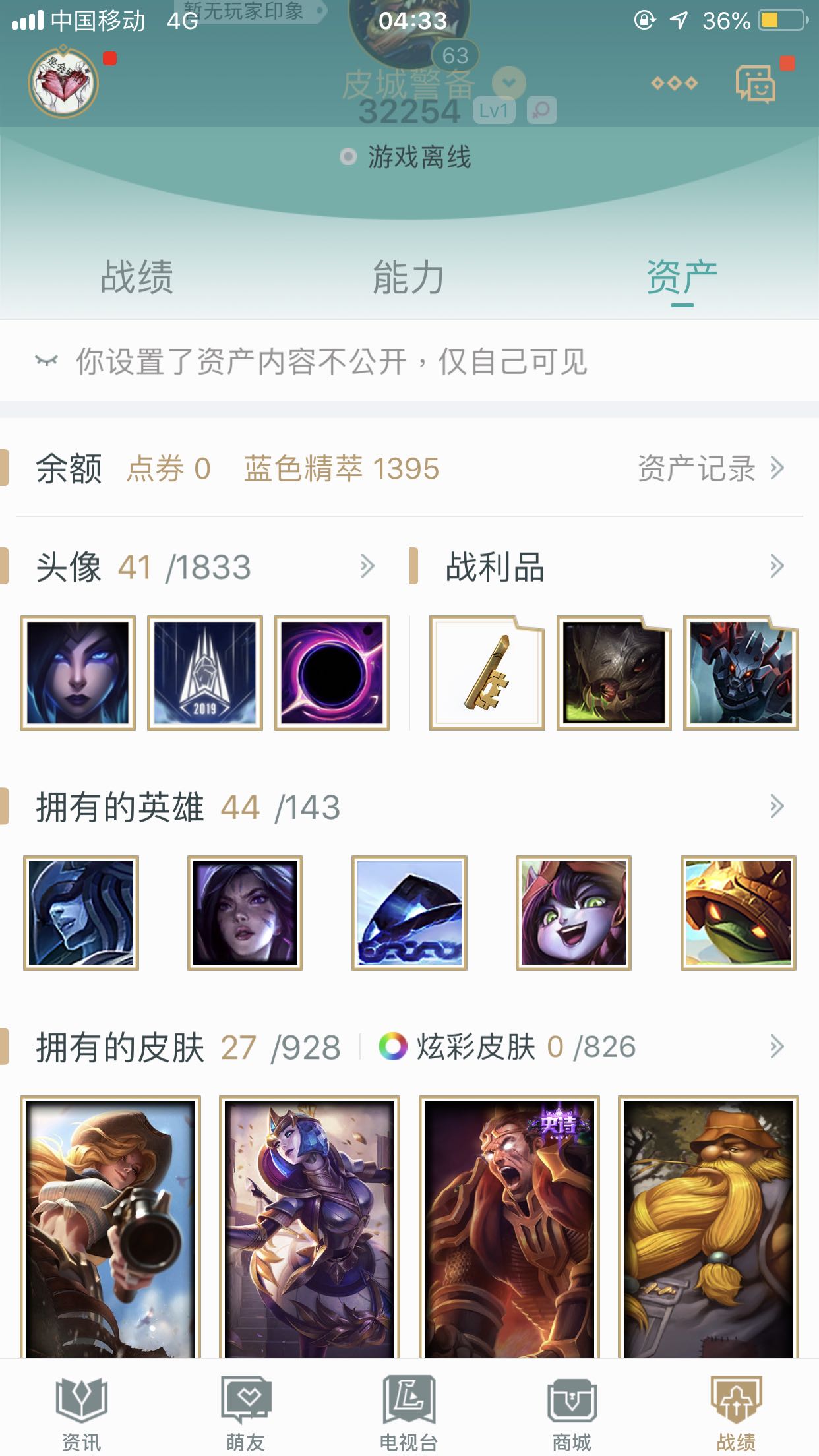 首页 > 租号大厅 > 英雄联盟 > 联盟三区/皮城警备 > 有44个英雄。 卡莎瑞文都有。27个皮肤 可打排位 虐菜局 想怎么玩就怎么玩