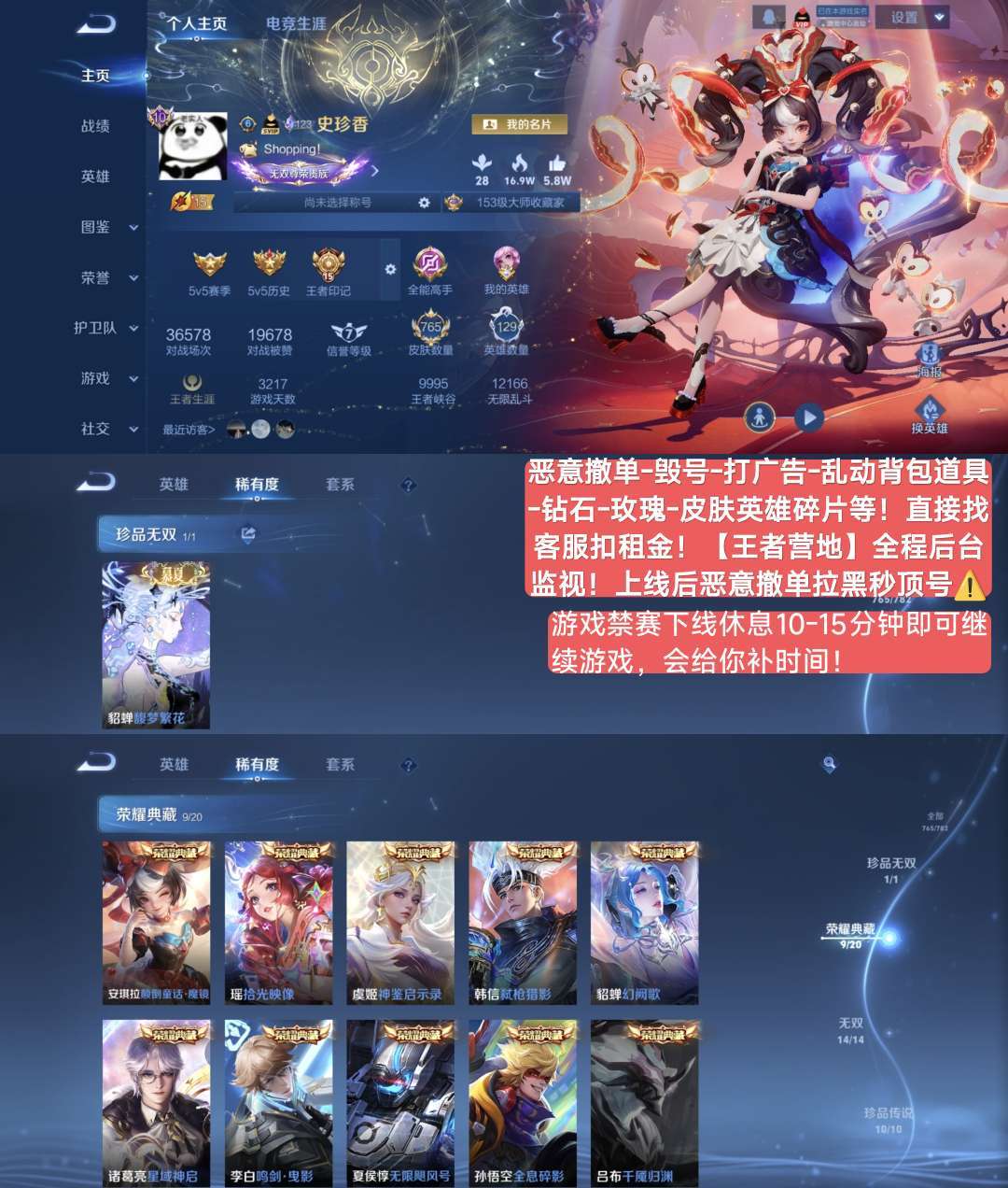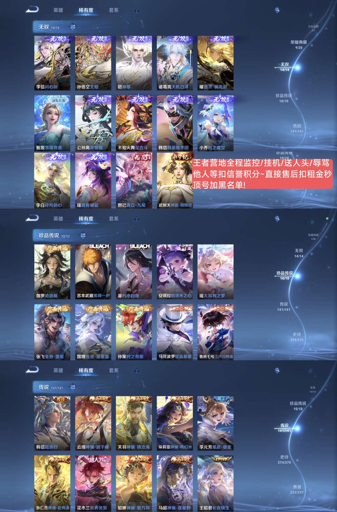 v10、537皮6水4无双、安琪拉-颠倒童话·魔镜、朵莉亚-神骥、遇见神鼓、齐天大圣、白虎志、韩信荣耀典藏、73传说、时之魔女、瑶无双、青丘、九尾、神器明辉仪
