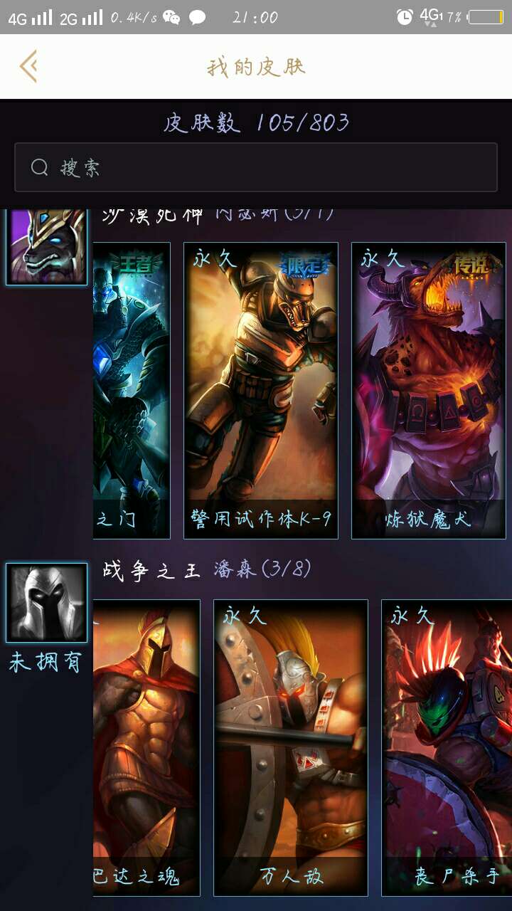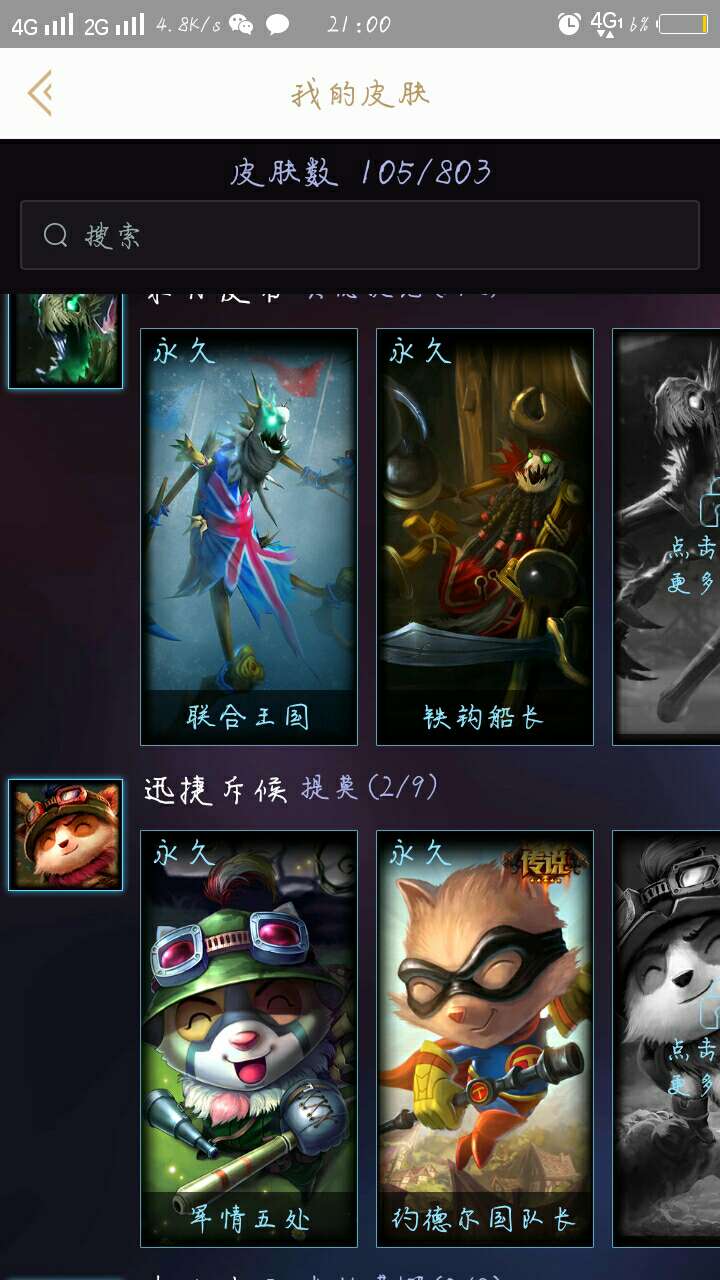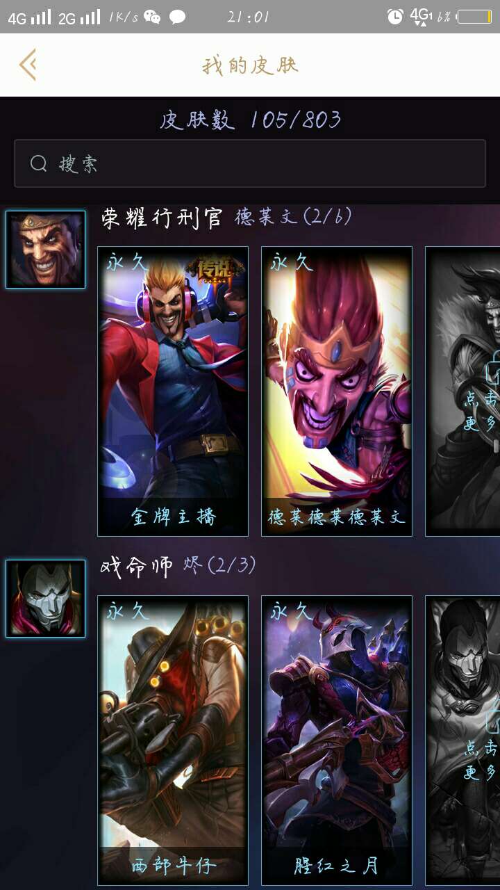 59英雄,105皮肤,有亚索西部牛仔,狗头炼狱魔犬,提莫约德尔国队长,盲僧地下拳王,德莱文金牌主播,烬西部牛仔猩红之月,皇子屠龙勇士