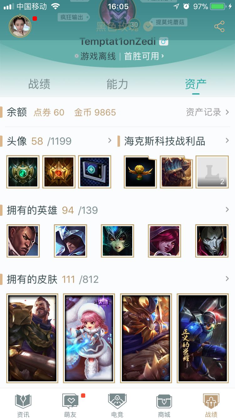 首页 > 租号大厅 > 英雄联盟 > 黑色玫瑰/黑色玫瑰 > 英雄94个够大家日常玩耍,可以排位,目前白金2,皮肤111个,泳池瞎,巧克力波比,会员限定卡牌,万圣瑞兹,大…